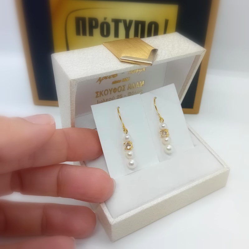 Για βραδυνές εμφανίσεις μακριά σκουλαρίκια από επιχρυσωμένο ασήμι και 3 πέρλες κι 1 τετράγωνο λευκό ζιργκόν.