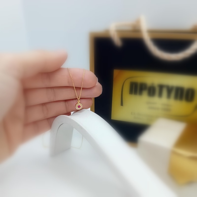 Πολύ κομψό κολιέ από επιχρυσωμένο ασήμι με ένα ζιργκόν απόχρωση ροζ magenta περιστοιχισμένο από διακριτικά λευκά ζιργκόν.