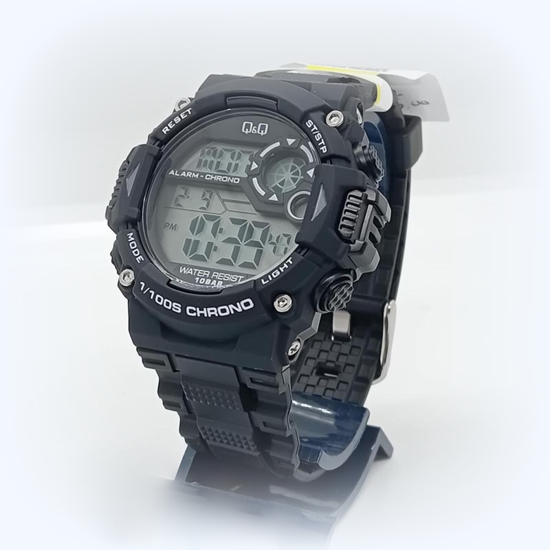 ΑΝΔΡΙΚΟ ΡΟΛΟΙ Q&Q με μπαταρία λιθίου, με λουράκι μαύρο καουτσούκ, αδιάβροχο στα 10 bar, με ξυπνητήρι, χρονόμετρο, ημερομηνία, 2η ψηφιακή ώρα, φως και βιδωτό καπάκι.