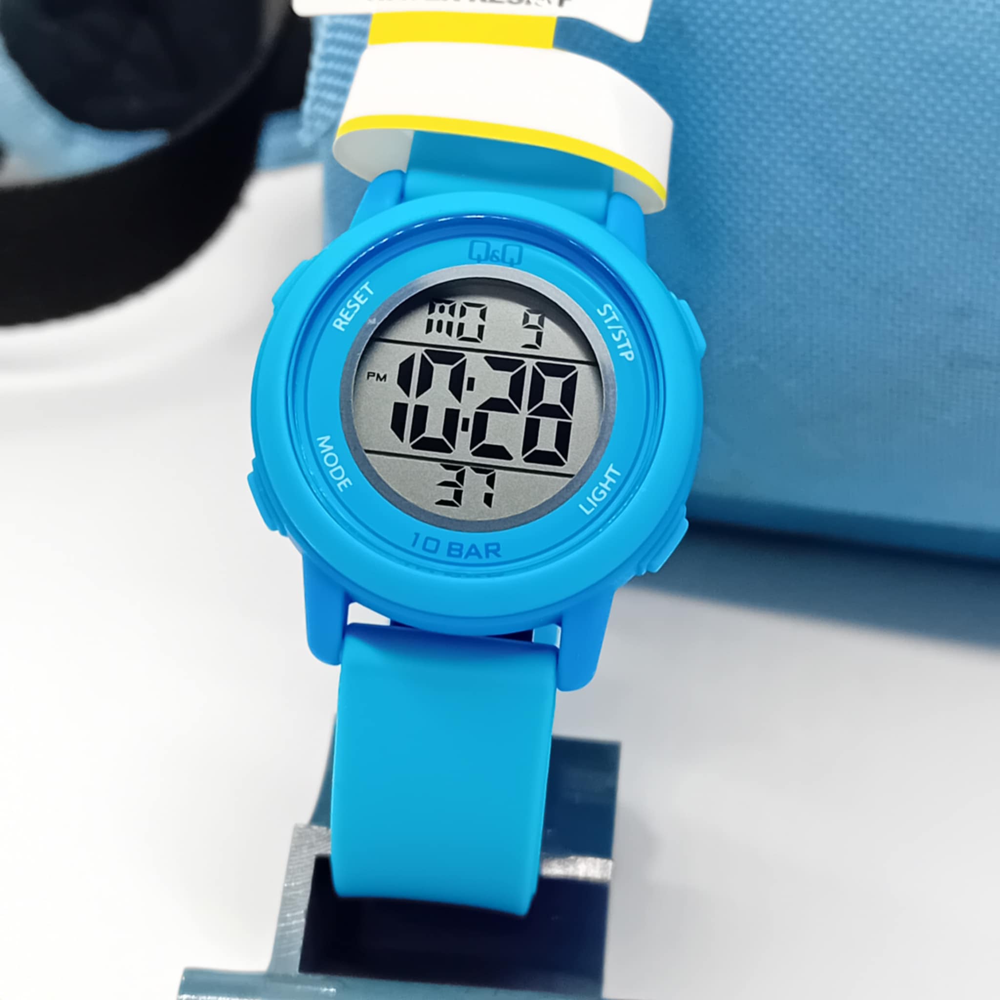 Ρολόι sportif γαλάζιο λουράκι σιλικόνης Q&Q στα 10 bar αδιάβροχο, με ξυπνητήρι, χρονόμετρο, ημερομηνία, 2η ψηφιακή ώρα και φως, βιδωτό καπάκι, με μπαταρία λιθίου.