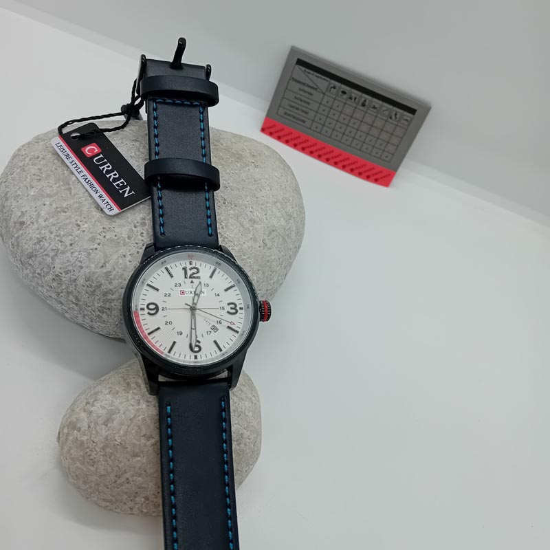 Casual εμφάνιση για τον άντρα με μοντέρνο ρολόι της εταιρείας CURREN με μαύρο λουράκι με μπλε εξώραφα, λευκό καντράν 44 mm διάμετρο, με ένδειξη ημερομηνίας, με quartz.