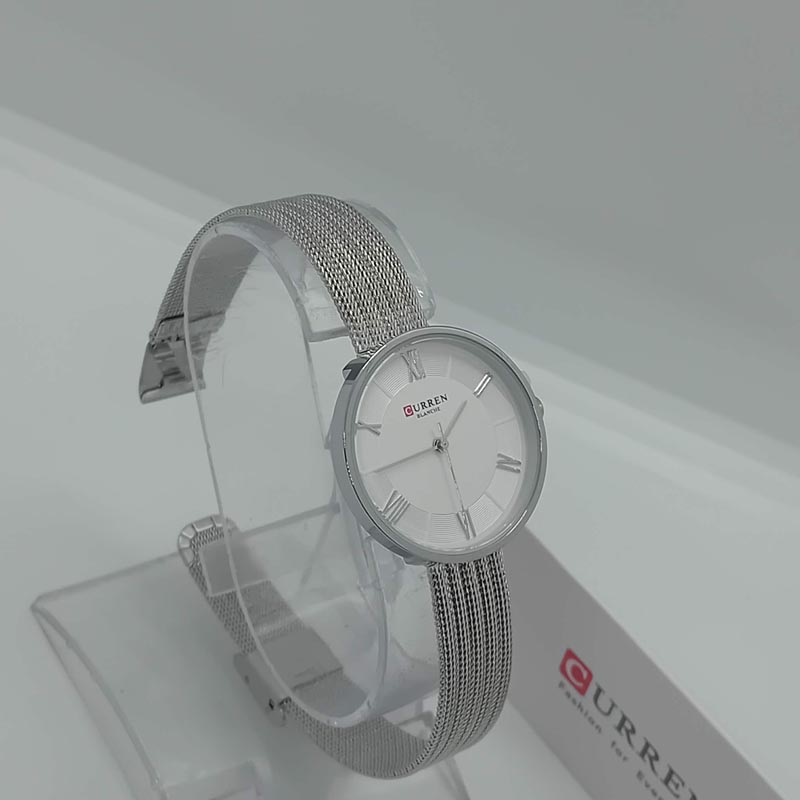 Γυναικείο ρολόι κομψό και εντυπωσιακό, με μηχανισμό quartz, λευκό καντράν με νίκελ λεπτομέρειες , με μπρασελέ-κάσωμα απο ατσάλι, ασημί απόχρωσης. Το μπρασελέ είναι ρυθμιζόμενο, τύπου ψάθα, νίκελ απόχρωση και λεπτό για περισσότερη φινέτσα και η διάμετρος του κασώματος είναι 32 mm.