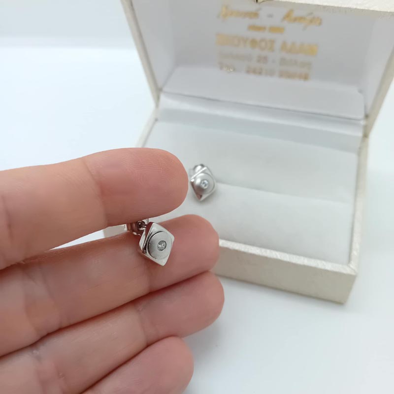 Λευκόχρυσοι ρόμβοι , συνδυασμός ματ και λουστρέ όψης, από λευκόχρυσο 14 καρατίων και μεγάλο κεντρικό ζιργκόν, ιδανικό κόσμημα για την κομψή γυναίκα σε κάθε εμφάνιση, ιδανικό για νύφη αλλά και για σοβαρό λουκ.