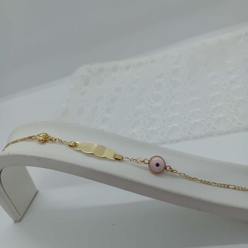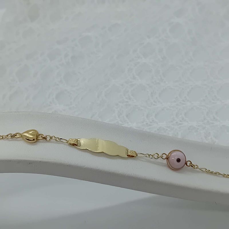 Πανέμορφη ταυτότητα για την μπέμπα από χρυσό 14 καρατίων με περίτεχνο περίγραμμα , καρδούλα και ροζ ματόχαντρο για προστασία από κάθε βασκανία.