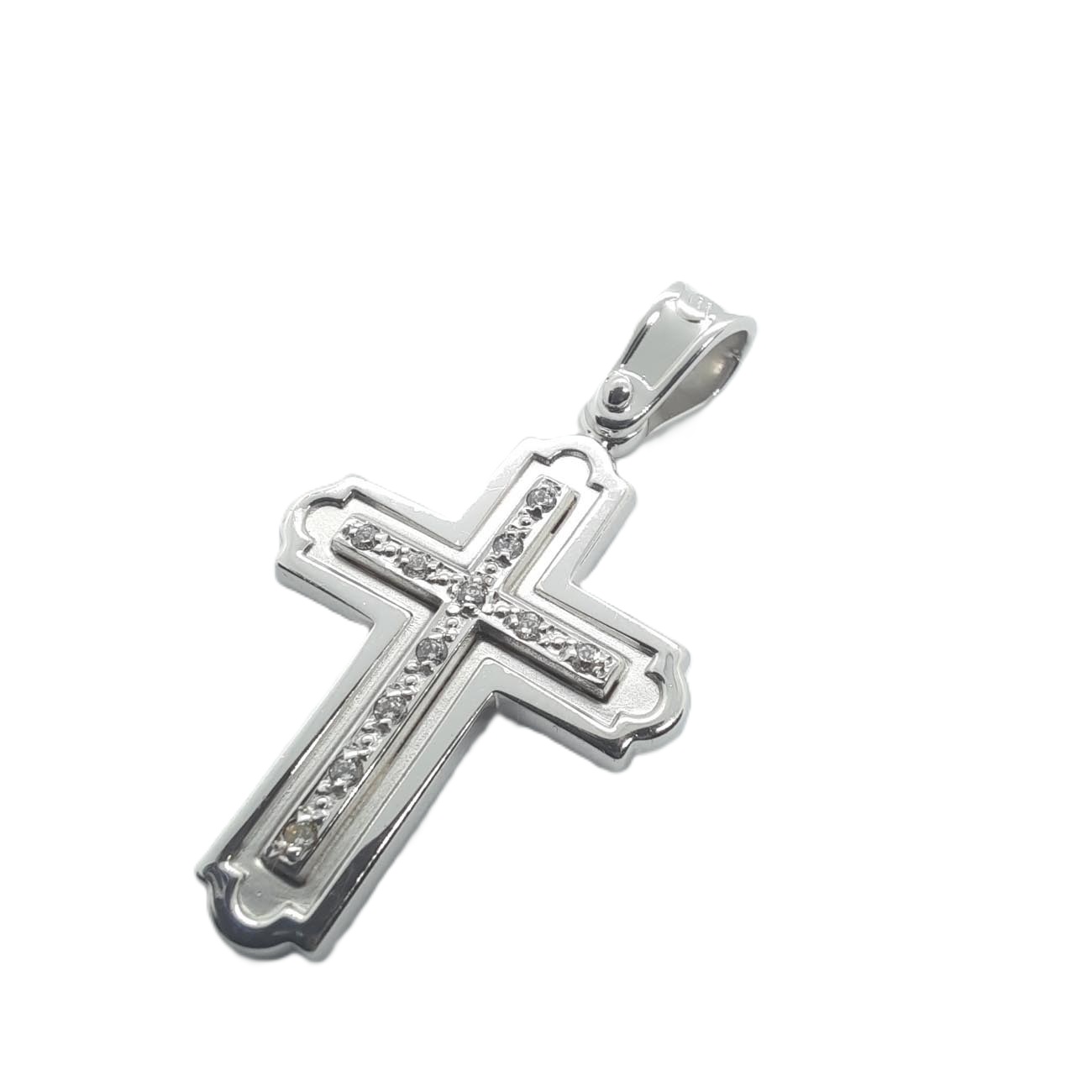 Λευκόχρυσος σταυρός 14 ΚΑΡΑΤΙΩΝ , με όμορφο & σοβαρό σχέδιο, με μικρά ζιργκόν και μεγάλο κρικάκι.