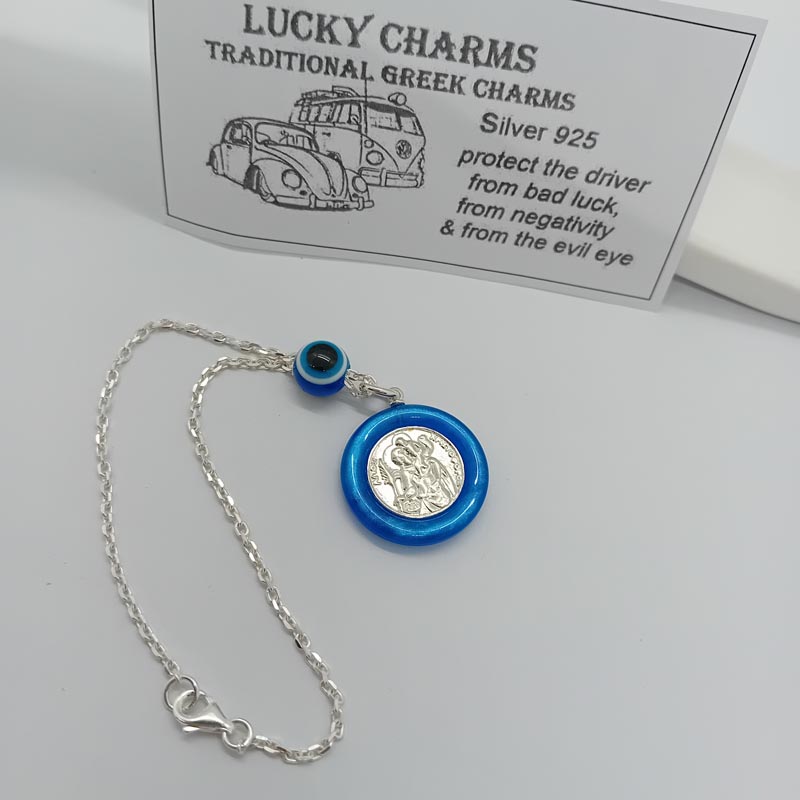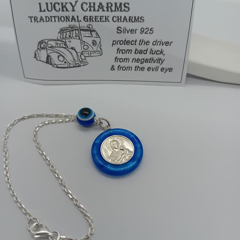 Ας έχουμε ασφαλή χιλιόμετρα με την ευλογία του Αγίου Χριστόφορου και της Παναγίας σε γούρι οχήματος από ΑΣΗΜΙ 925 , διπλής όψης.