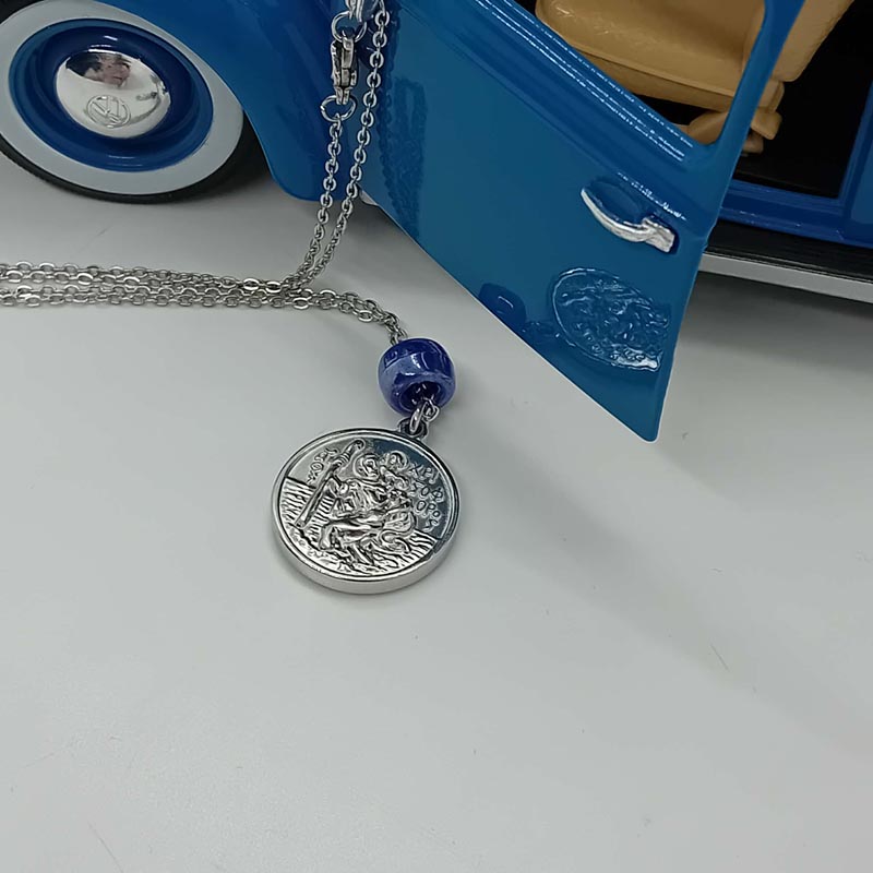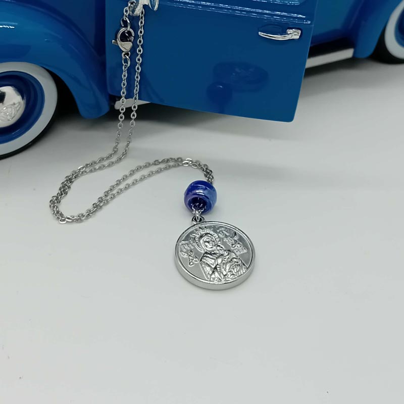 Για το όχημά μας προστασία: ο ΑΓΙΟΣ ΧΡΙΣΤΟΦΟΡΟΣ & η ΠΑΝΑΓΙΑ σε γούρι από ατσάλι με αλυσίδα και χάντρα σκούρα μπλε απόχρωση.