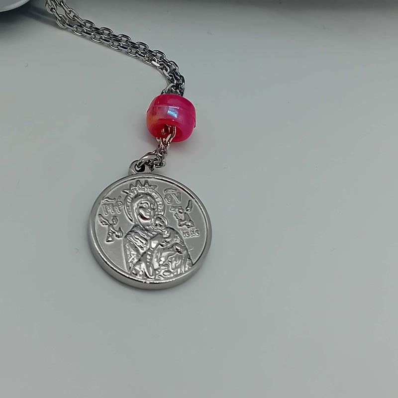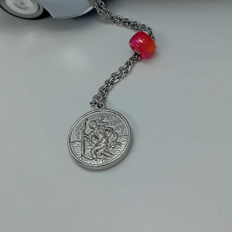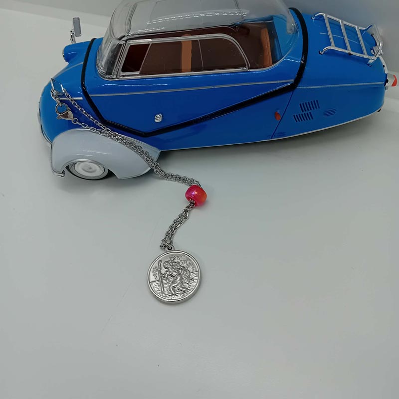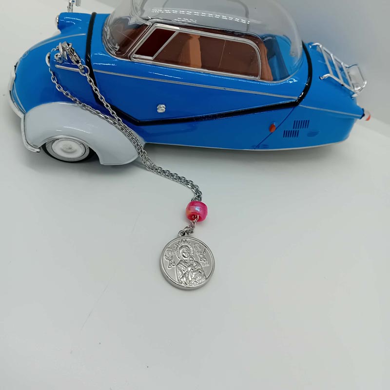 Ντουμπλ-φας γούρι οχήματος , στην μια όψη ο ΑΓΙΟΣ ΧΡΙΣΤΟΦΟΡΟΣ και στην άλλη όψη η ΠΑΝΑΓΙΑ με ροζ ματζέντα χάντρα.