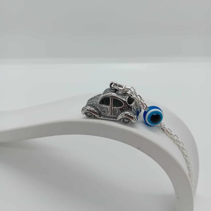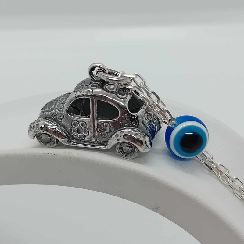 Χαριτωμένο γούρι οχήματος από μαυρισμένο ασήμι 9.25 με σκαραβαίο τρισδιάστατο και μεγάλο ματόχαντρο.