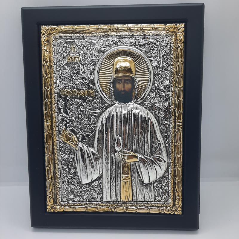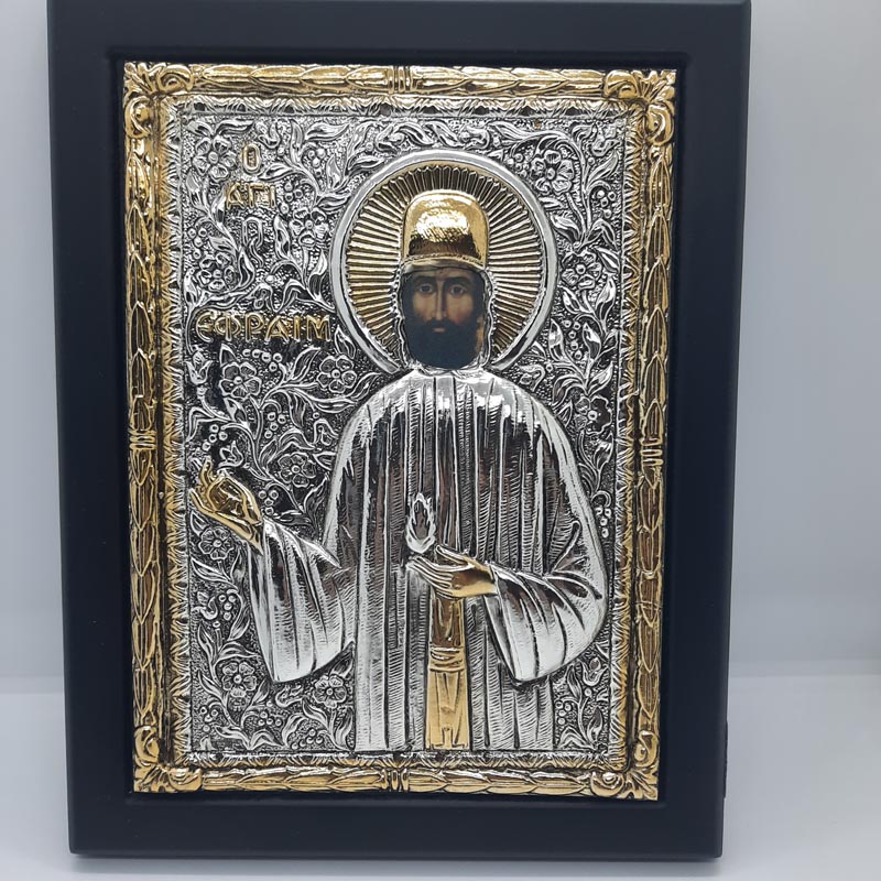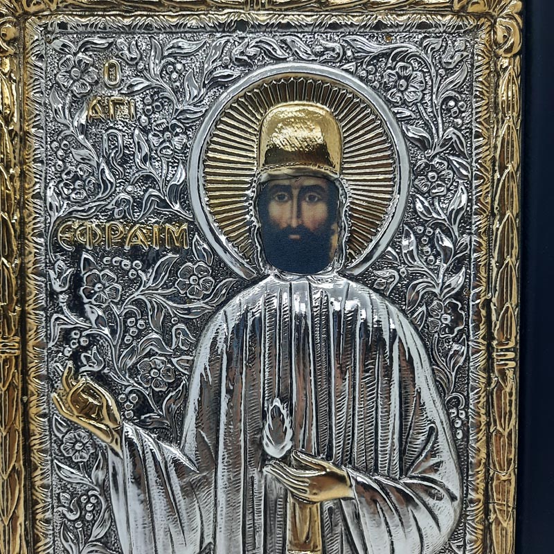 Δώρο πίστης και ευλογίας, ο μεγαλομάρτυς ΑΓΙΟΣ ΕΦΡΑΙΜ ΝΕΑΣ ΜΑΚΡΗΣ, από ασήμι και επίχρυσε λεπτομέρειες σε μαύρο ξύλινο σοβαρό πλαίσιο.