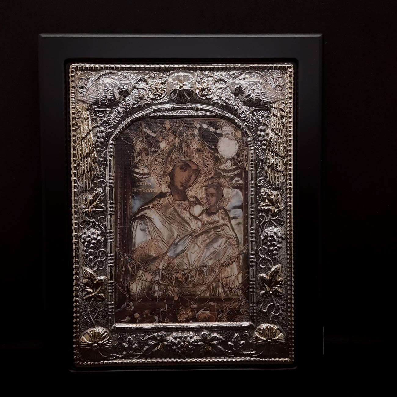Ασημένια εικόνα επιχρυσωμένη της Παναγίας με πλαίσιο από μασίφ ξύλο, εξαιρετικό δώρο αγάπης και σεβασμού για επαγγελματικούς συνεργάτες, καθώς και νεόνυμφους αλλά και για τους κουμπάρους.