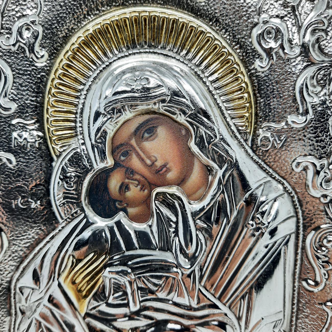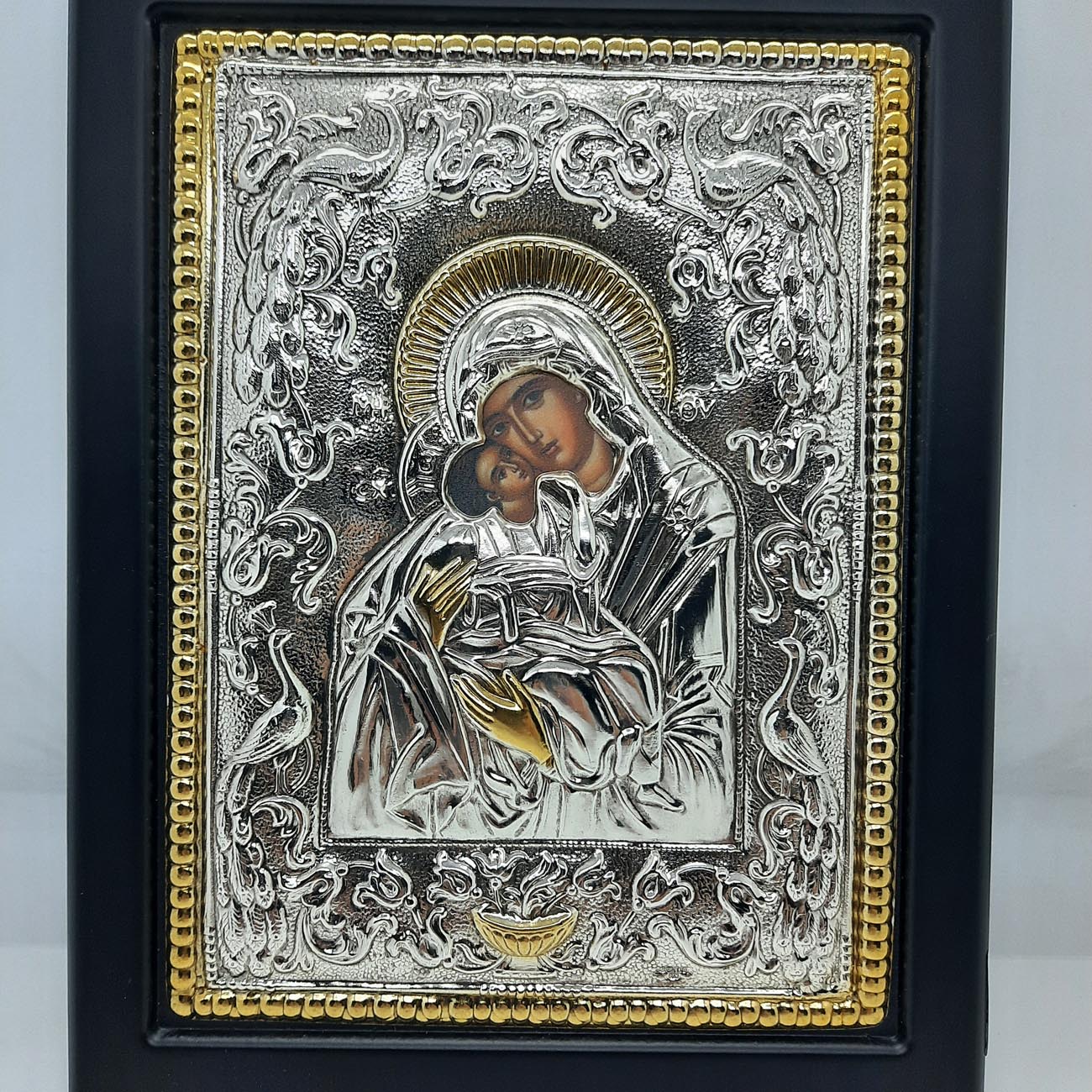 Παναγία η Γλυκοφυλούσα, γλυκύτατη μορφή με τον Χριστό στην αγκαλιά της, από ασήμι με ειδική επεξεργασία ώστε να μην μαυρίζει, με επίχρυσες λεπτομέρειες στην μπορντούρα, στο φωτοστέφανο και στα χέρια Της , πλαισιωμένη από ξύλο σε μαύρο σοβαρό χρώμα. Ιδανικό αντικείμενο λατρείας και πίστης.