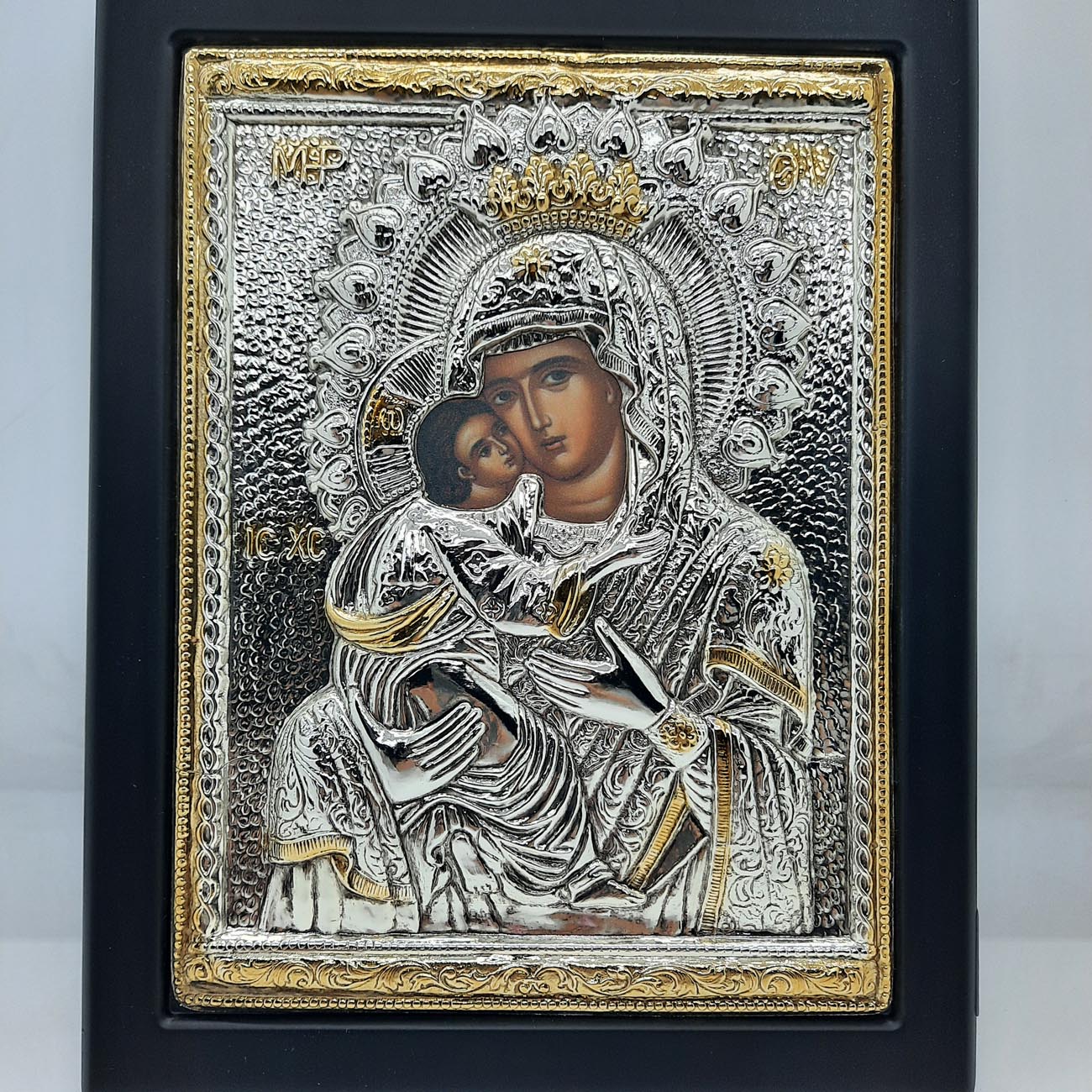 Ασημένια εικόνα της Παναγία με το Θείο Βρέφος, υπέροχο σκάλισμα, πολλές επίχρυσες λεπτομέρειες, σε μαύρο ξύλινο πλαίσιο. Ιδανικό απόκτημα πίστης και αγάπης.