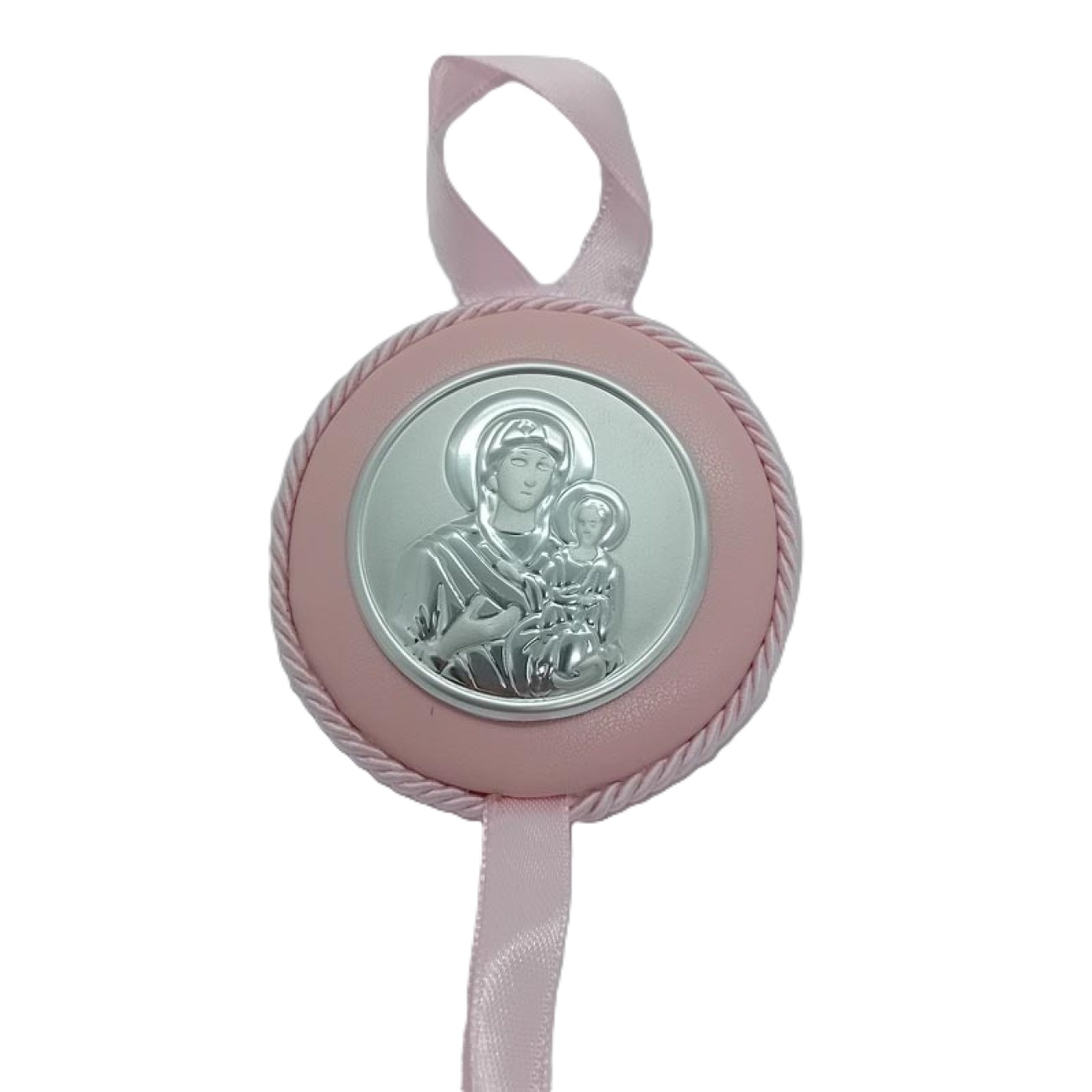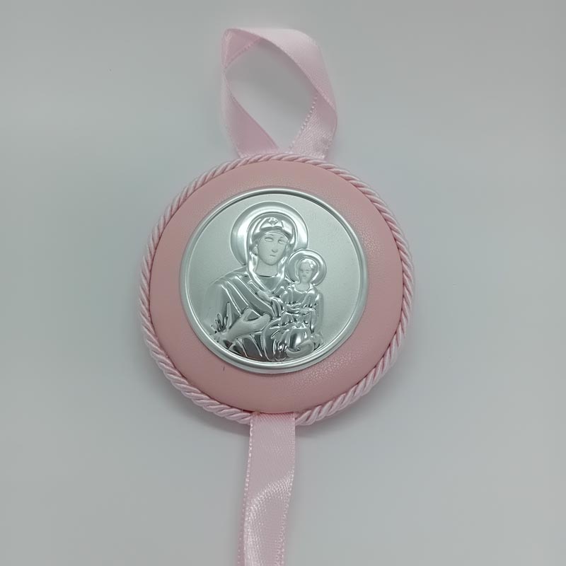 Πολύ όμορφη εικόνα μικρή, στρογγυλή, από ασήμι 9.25 επιπλατινωμένο, με ανάγλυφη Παναγία, πλαίσιο από ροζ δερματίνη , με κορδόνι και σατέν κορδέλα όλα σε ροζ απόχρωση, ιδανική για την κούνια της μπέμπας.