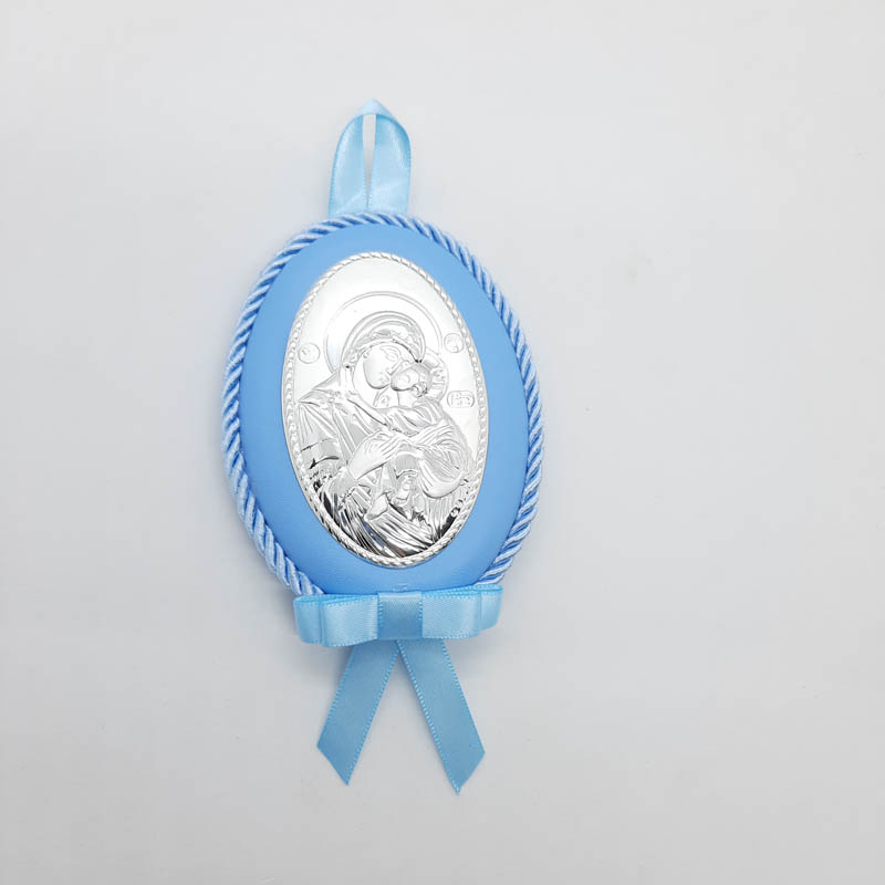 Για την κούνια ή το κρεβατάκι εικόνα Παναγίας ασημένια με όμορφες ανάγλυφες λεπτομέρειες, οβάλ σχήμα, σε γαλάζια απόχρωση από δερματίνη και σατέν κορδόνι.