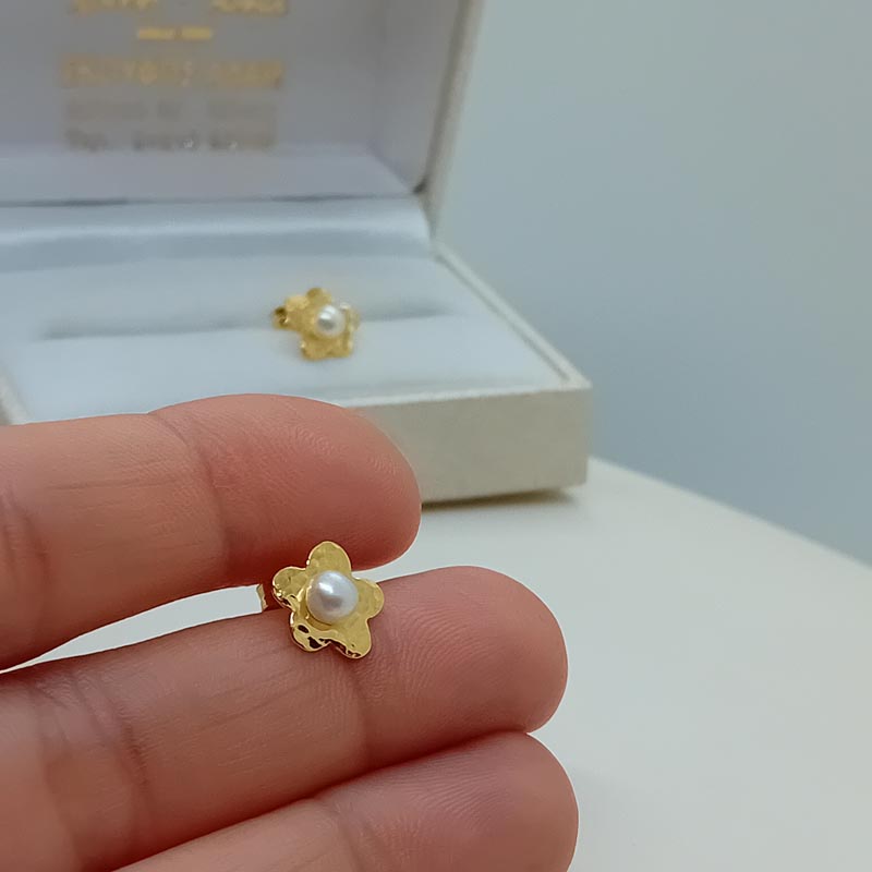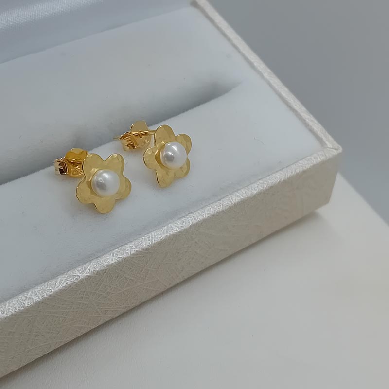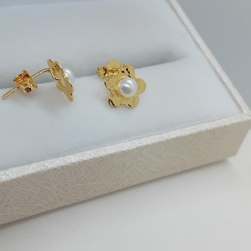 Ιδανικά για όλες τις ώρες, σκουλαρίκια κομψά, θηλυκά και διαχρονικά άνθη από ασήμι επιχρυσωμένο, σφυρήλατη επιφάνεια με κεντρική μεγάλη πέρλα λευκή απόχρωση.