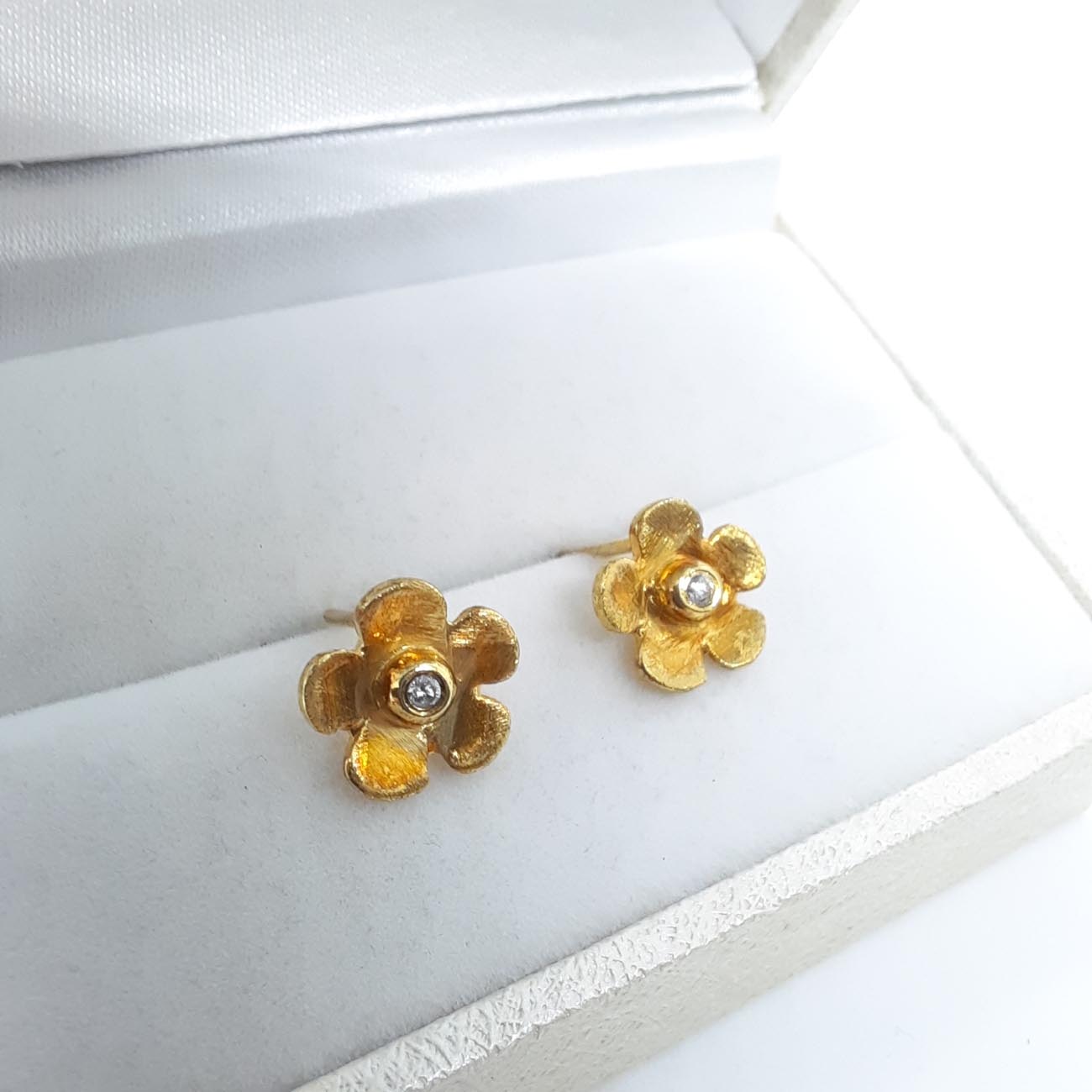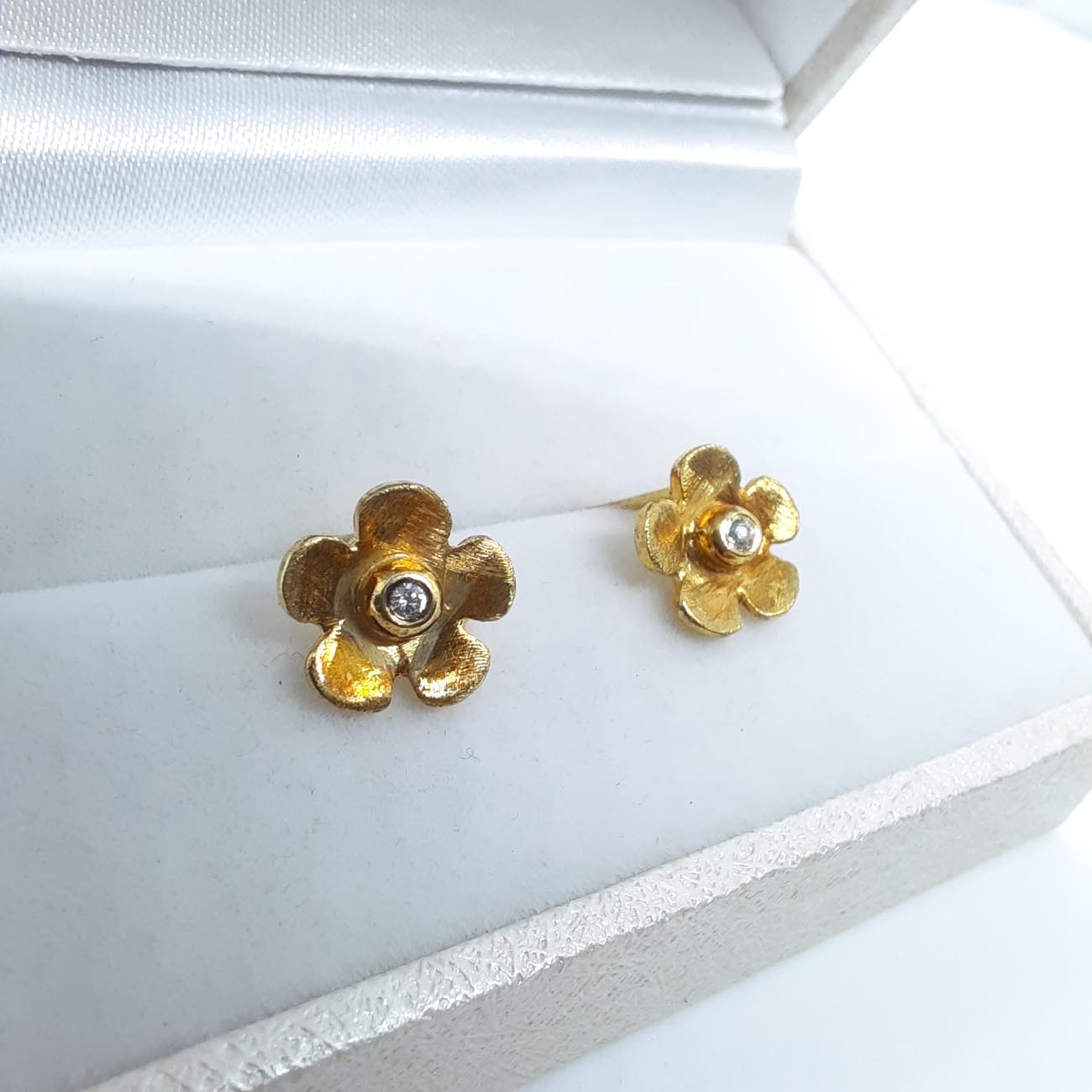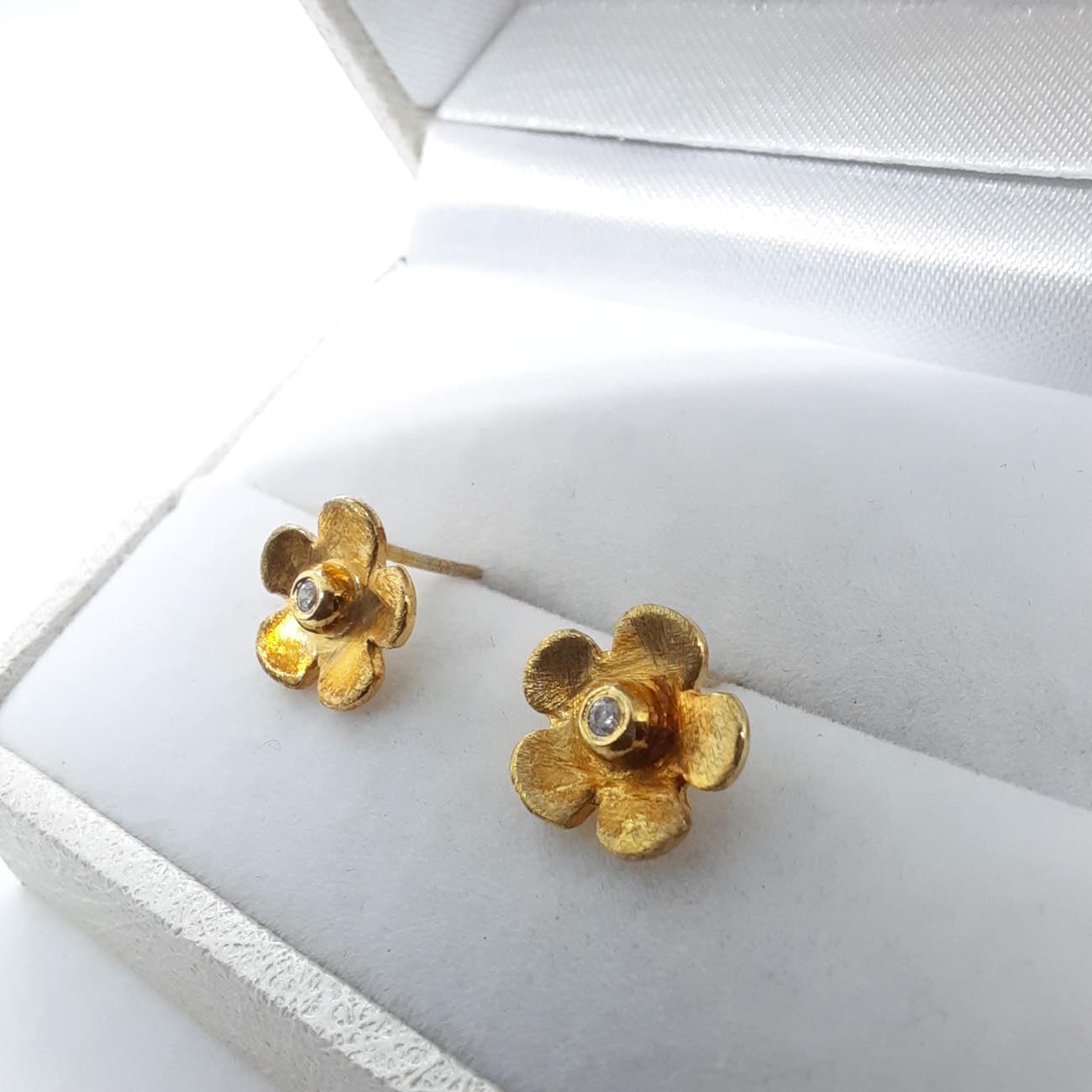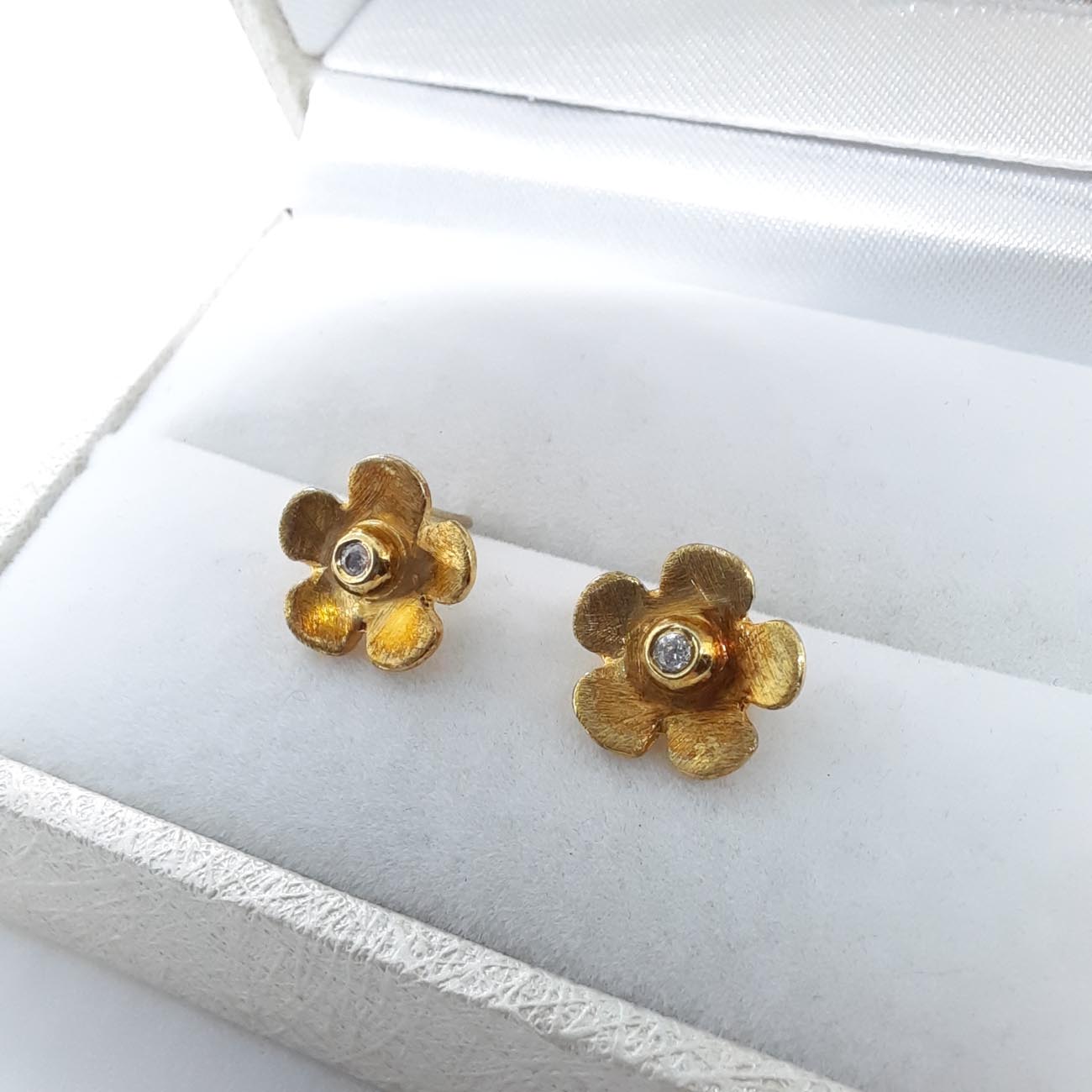 Υπέροχο design άνθος, επιχρυσωμένα ασημένια σκουλαρίκια, ματ όψη, με κεντρικό ευδιάκριτο λευκό ζιργκόν, διαχρονικά και ρομαντικά.