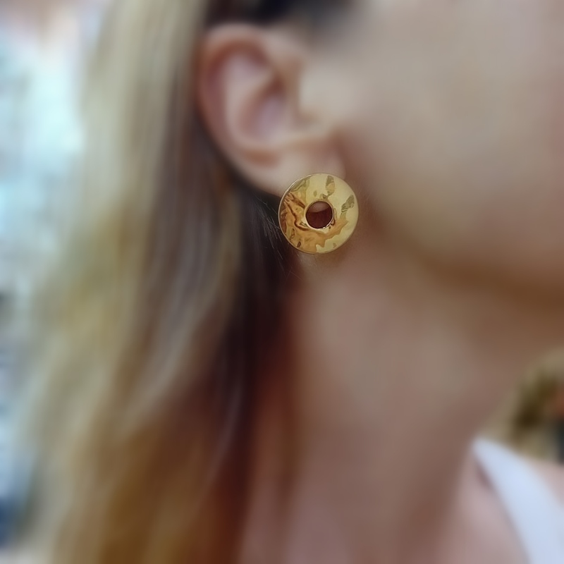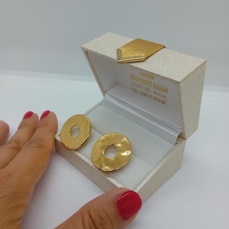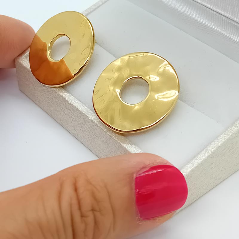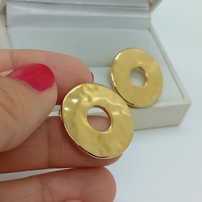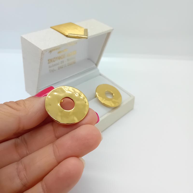 Αποπνέουν κομψότητα και πλούσιο στυλ αυτά τα σκουλαρίκια σε design δίσκου, με ελαφρώς σφυρήλατη επιφάνεια και με τρύπα στην μέση, από επιχρυσωμένο ασήμι.