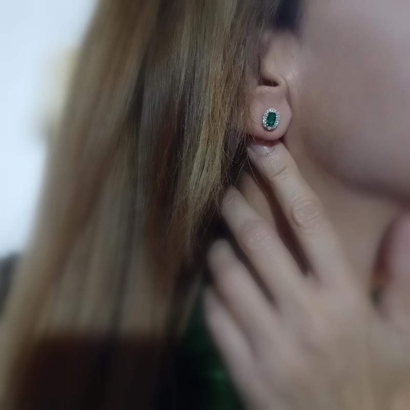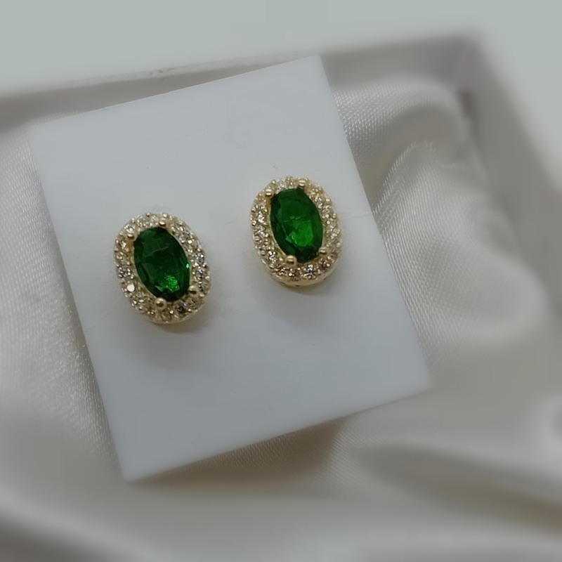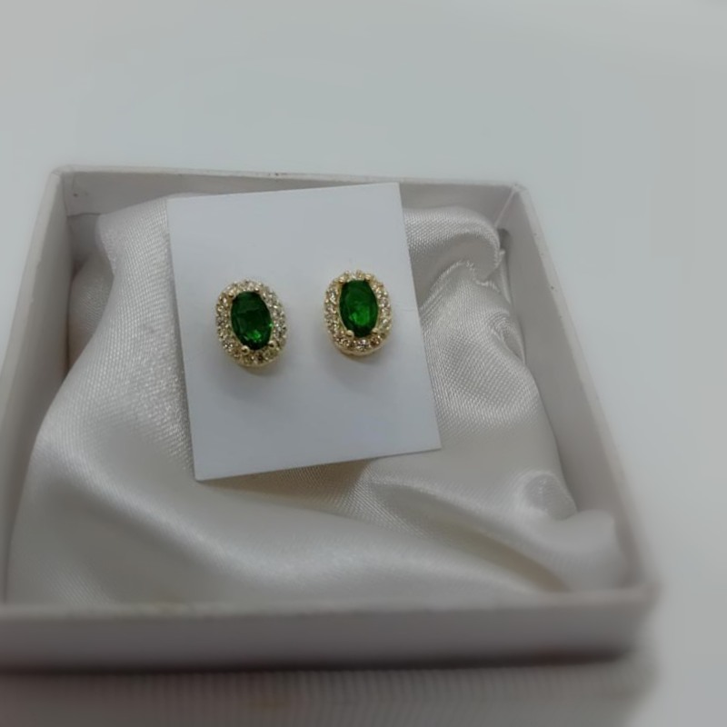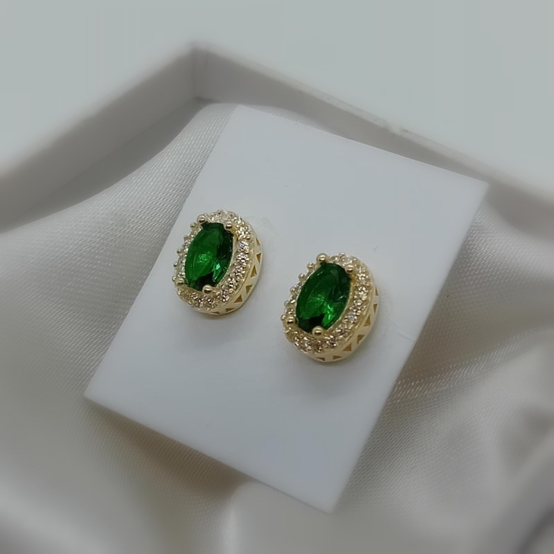 Αστραφτερή επιλογή για βραδινή εμφάνιση! Σκουλαρίκια κουμπωτά από επιχρυσωμένο ασήμι , σε οβάλ design, με οβάλ πράσινη πέτρα ζιργκόν περιστοιχισμένη από λευκά ζιργκόν.