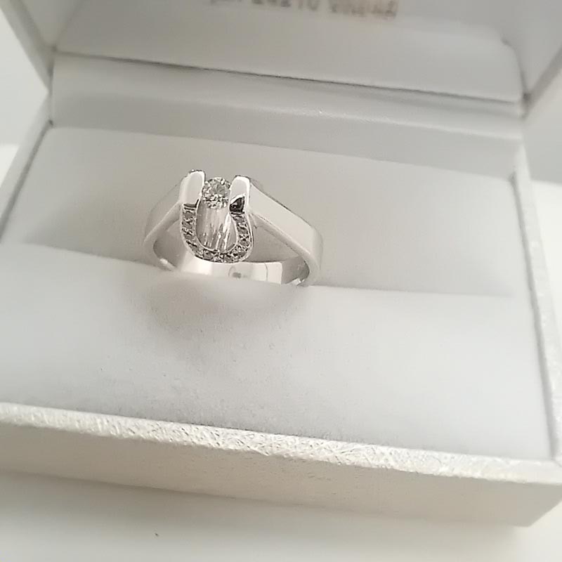 Σας προτείνουμε ένα ονειρεμένο κόσμημα! Δαχτυλίδι λευκόχρυσο, 18 ΚΑΡΑΤΙΩΝ, με μια πρωτότυπη όψη που θυμίζει τυχερό πέταλο, στολισμένο με 20 αστραφτερά μικρά μπριγιάν, με ένα υπέροχο διαμάντι στο κέντρο μιας γοητευτική καμπύλης, με φαρδιά λουστρέ "γάμπα"! ΧΑΡΑΚΤΗΡΙΣΤΙΚΑ: μέγεθος του κεντρικού μπριγιάν: 0.13 Μέγεθος των 20 μικρών μπριγιάν: 0.10  Clarity: VS1, Χρώμα H, Νούμερο 49 . Με διεθνή εγγύηση ποιότητας. ( ΠΡΟΣΟΧΗ! Ο συγκεκριμένος κωδικός ΔΕΝ ΔΙΑΤΙΘΕΤΑΙ στο κατάστημά μας. Μπορείτε να εξυπηρετηθείτε μόνο κατόπιν ραντεβού στο φυσικό μας κατάστημα ώστε να γίνει παραγγελία. )