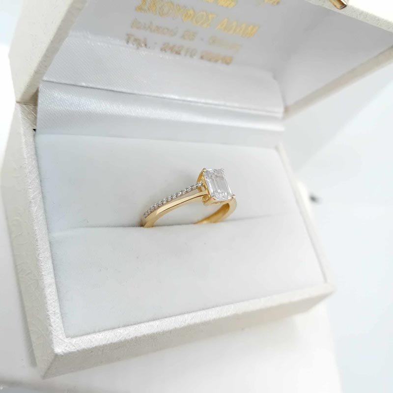 Κομψό μονόπετρο δαχτυλίδι από χρυσό 14 ΚΑΡΑΤΙΑ με πρωτοτυπία στο design και με κεντρικό ορθογώνιο ζιργκόν και πολλά μικρά ζιργκόν στις γάμπες εκατέρωθεν.