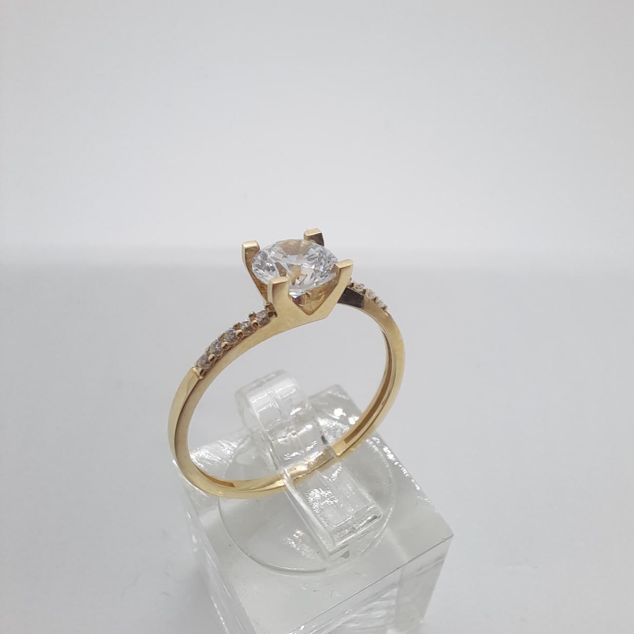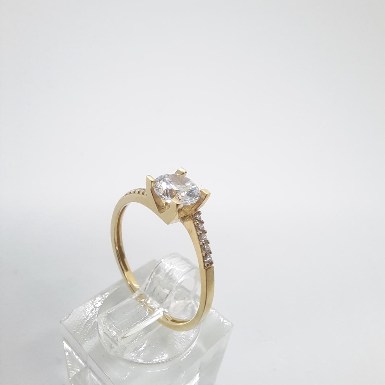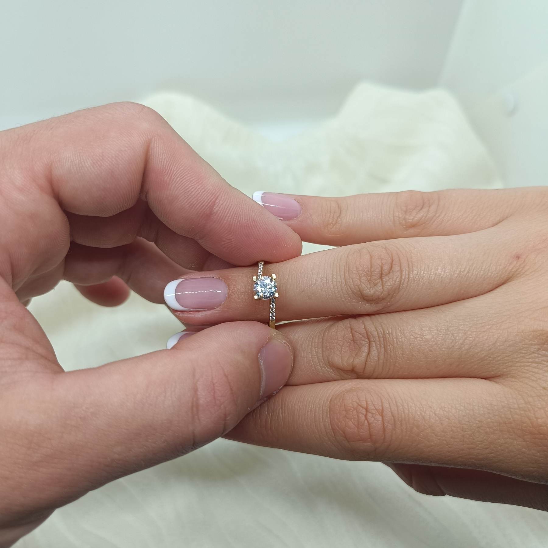 Υπόσχεση αιώνιας αγάπης με δαχτυλίδι αρραβώνων από χρυσό Κ9 με λευκά ζιργκόν στις ασύμμετρες γάμπες του και κεντρικό λευκό ζιργκόν, πολύ θηλυκό και ρομαντικό design.