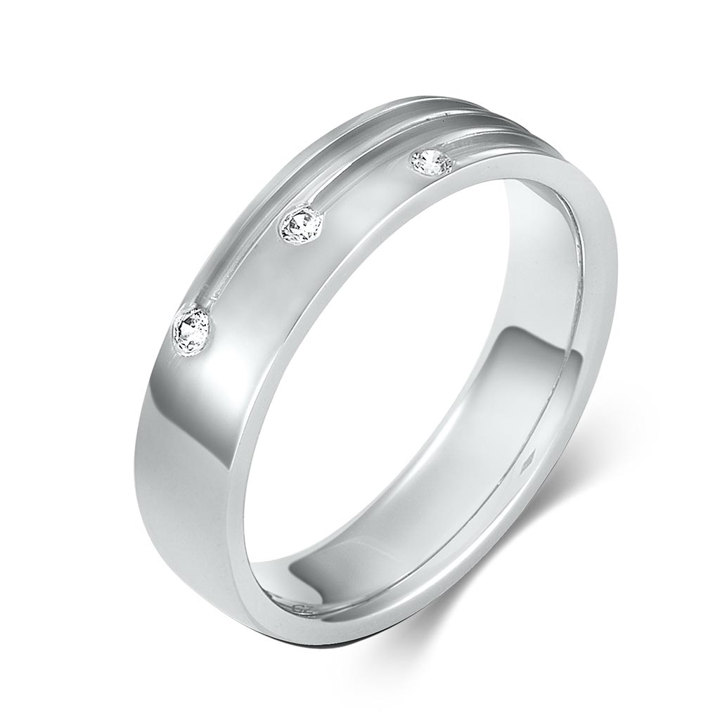 Βέρα σε φαρδιά γραμμή από λευκόχρυσο με 3 χαραγμένα αυλάκια που καταλήγουν σε 3 εντυπωσιακά λευκά ζιργκόν, κατόπιν παραγγελίας.