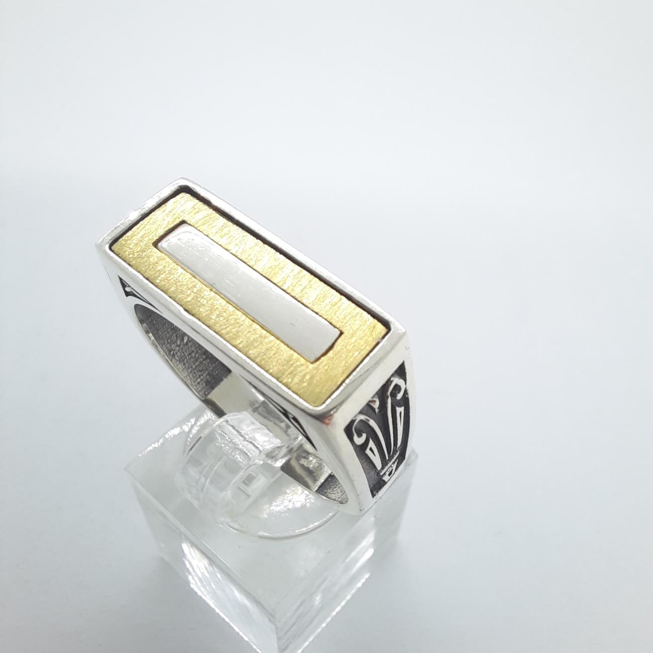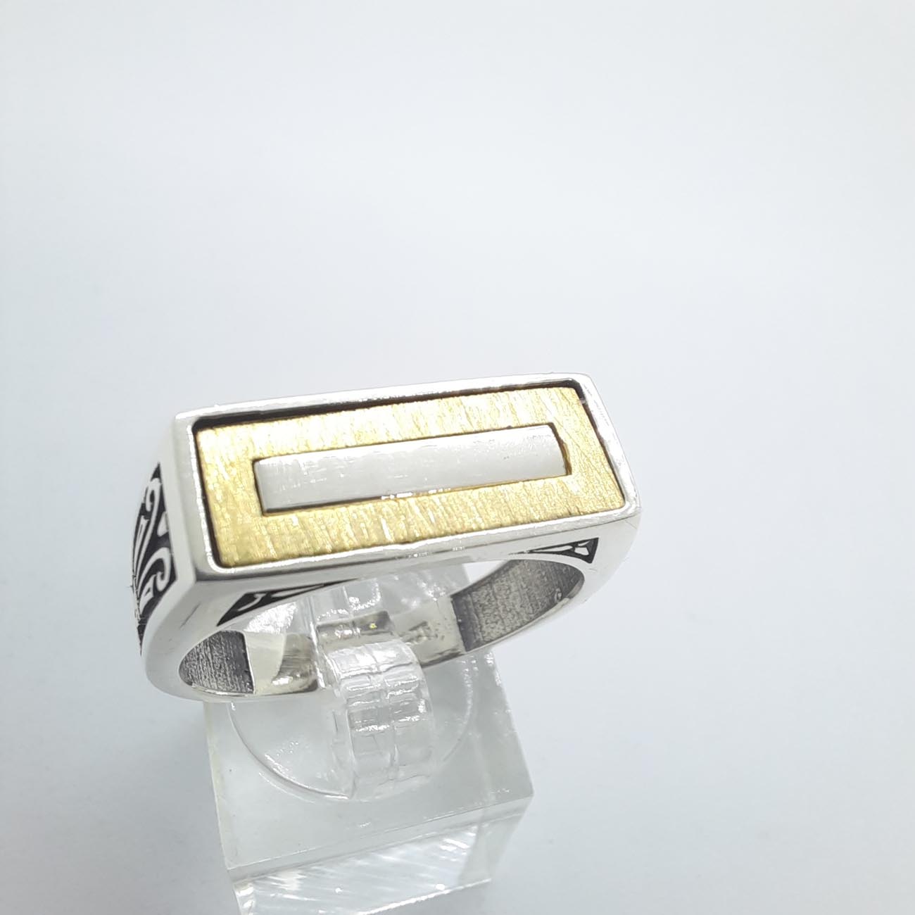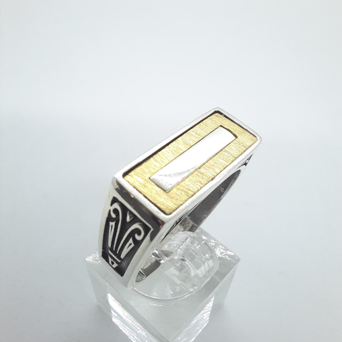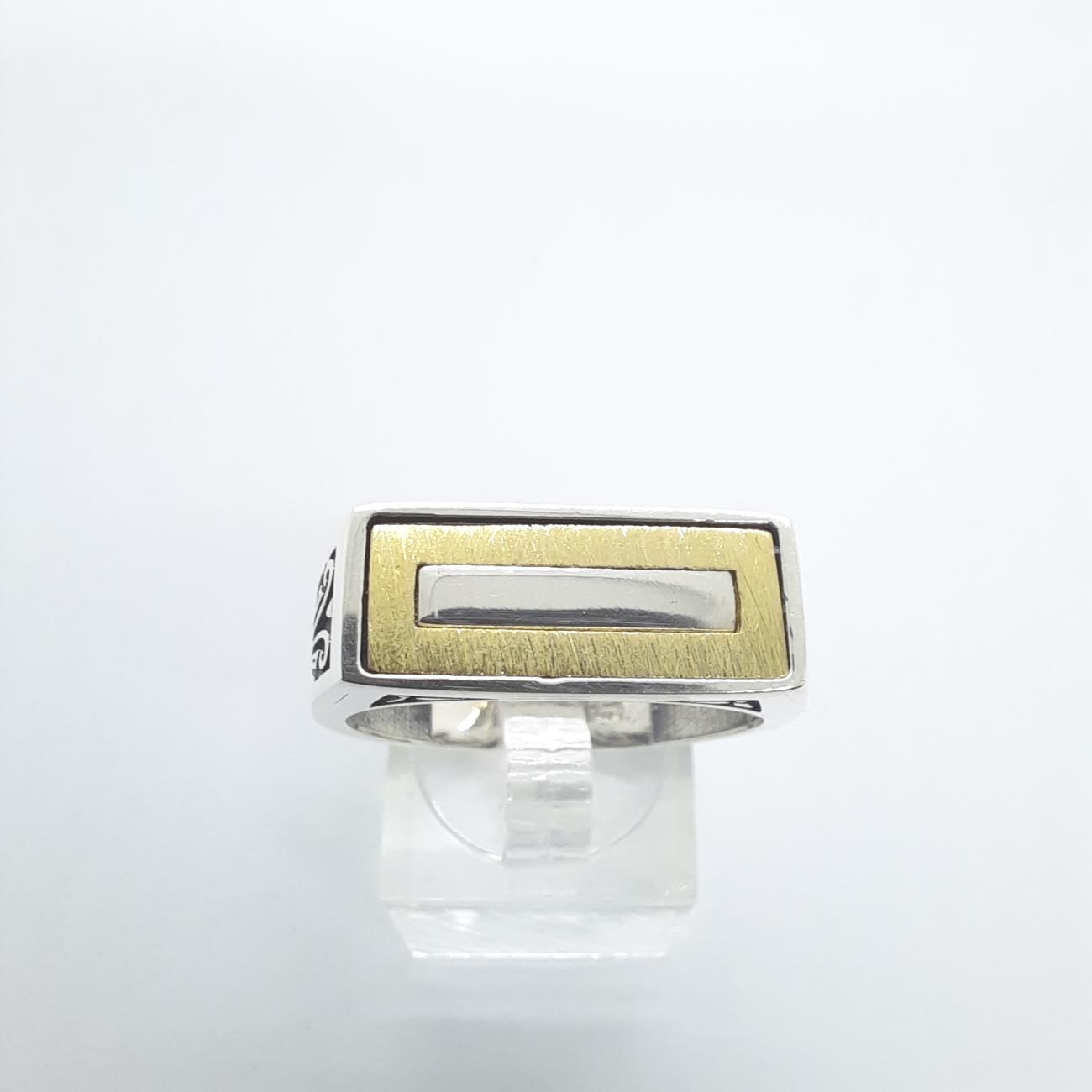 Υπέροχο minimal design από ασήμι, με επιχρυσωμένη λεπτομέρεια στην μπροστινή όψη και σκαλιστές πλαϊνές πλευρές , ένα πραγματικά όμορφο κόσμημα για τον ξεχωριστό άντρα.