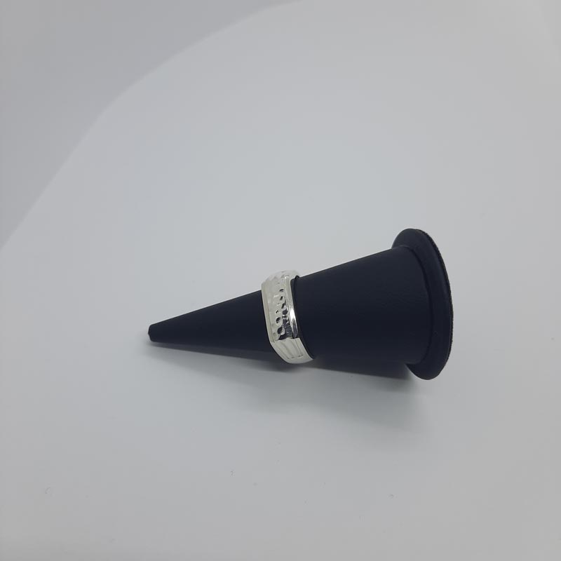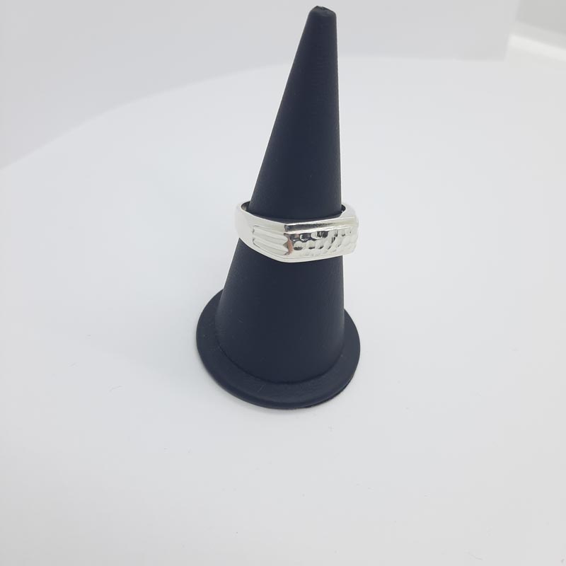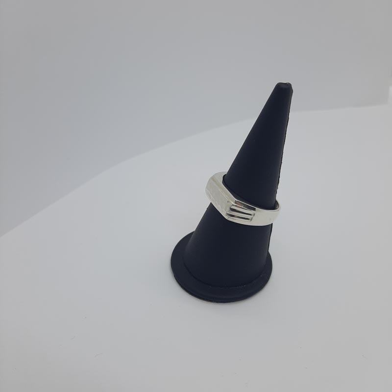 Ασημένιο δαχτυλίδι 9.25 με εντυπωσιακή σφυρήλατη μπροστινή όψη και διακριτικό σκάλισμα στις πλαϊνές γάμπες, νεανικό design εμπνευσμένο από την Αρχαία Ελλάδα.