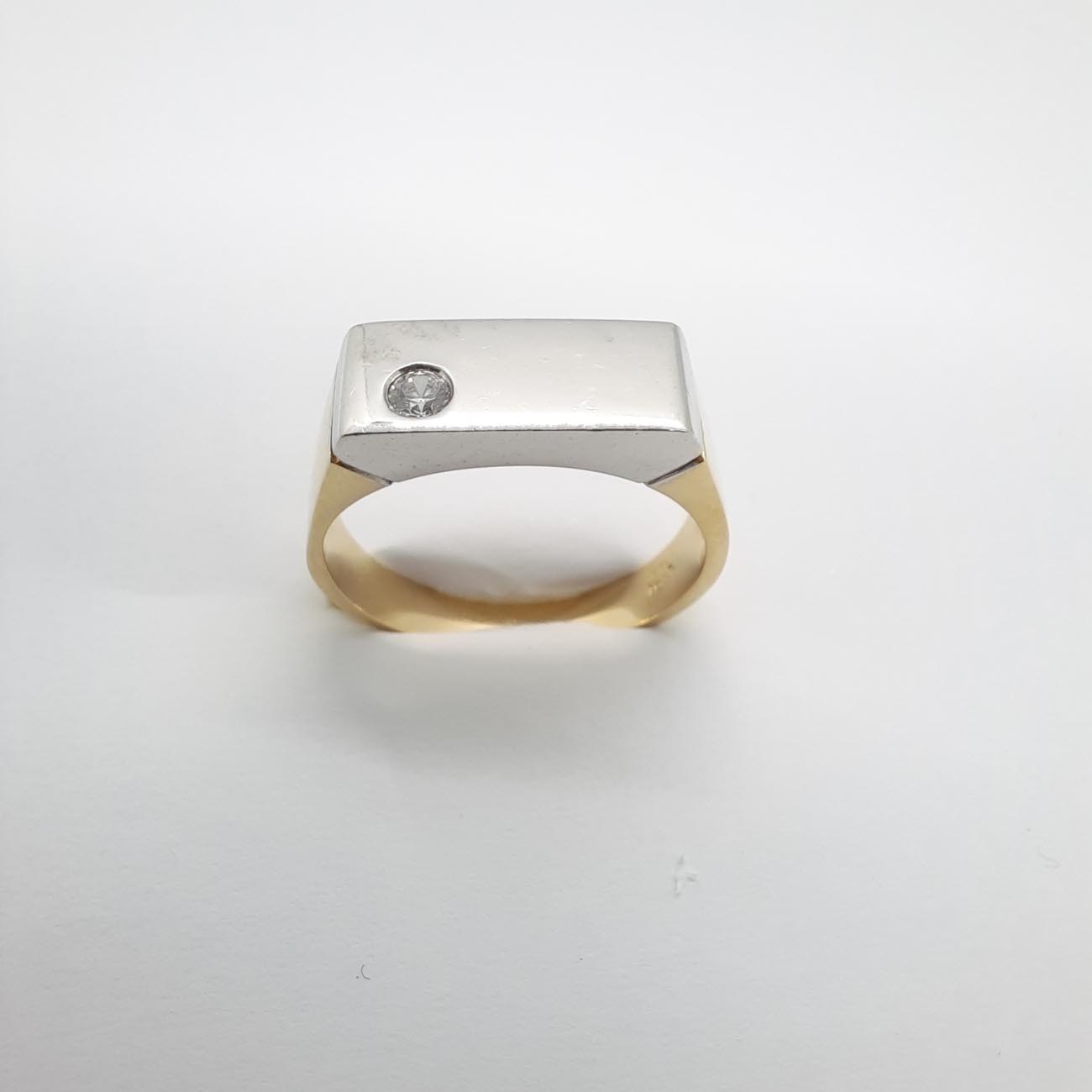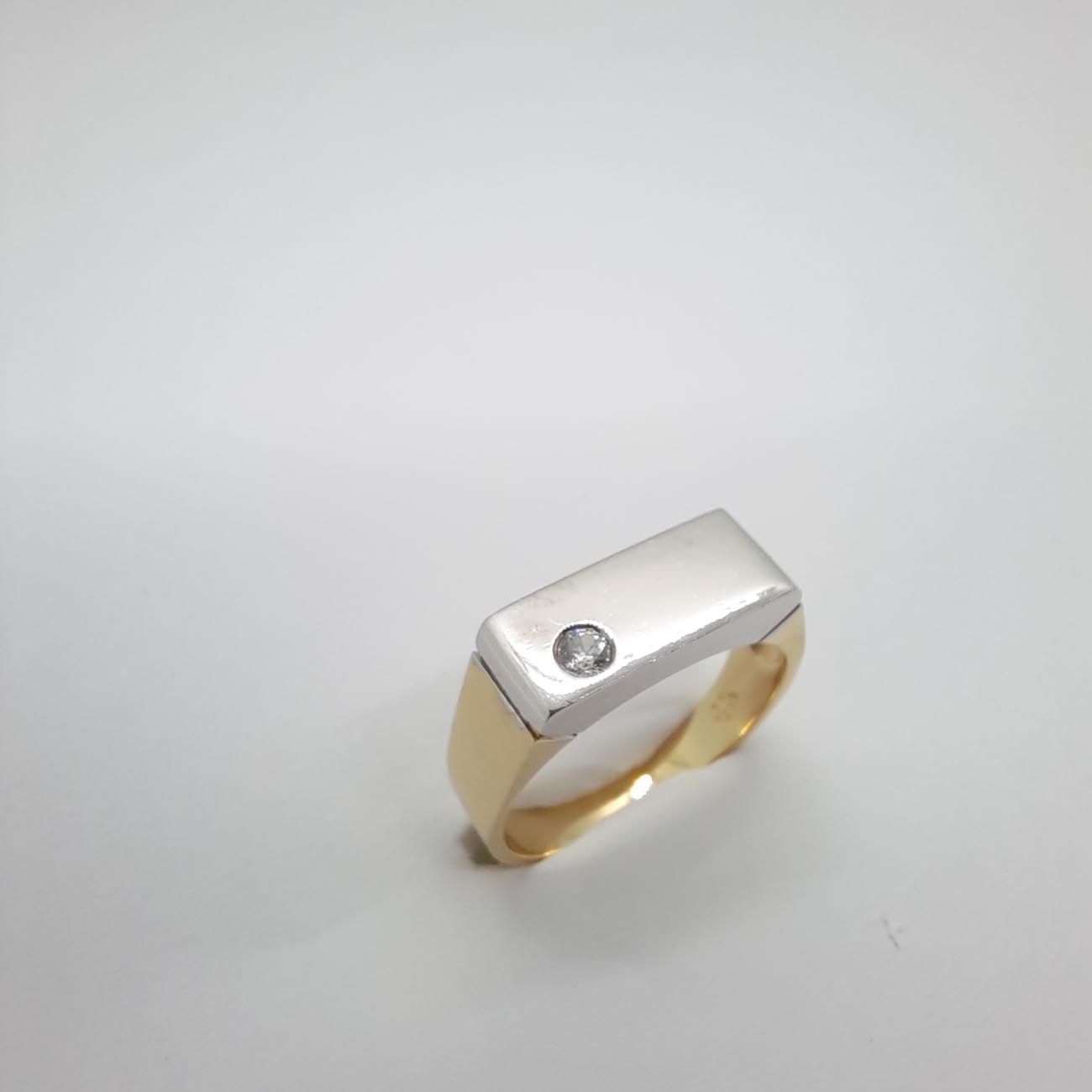 Για τον κομψό άντρα χρυσό δαχτυλίδι 14 ΚΑΡΑΤΙΑ με λευκόχρυση φαρδιά επιφάνεια, με ευδιάκριτο λευκό ζιργκόν και χρυσή φαρδιά γάμπα.