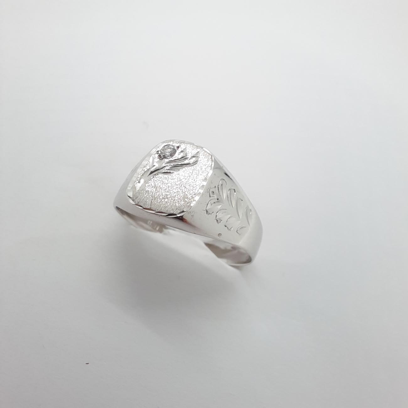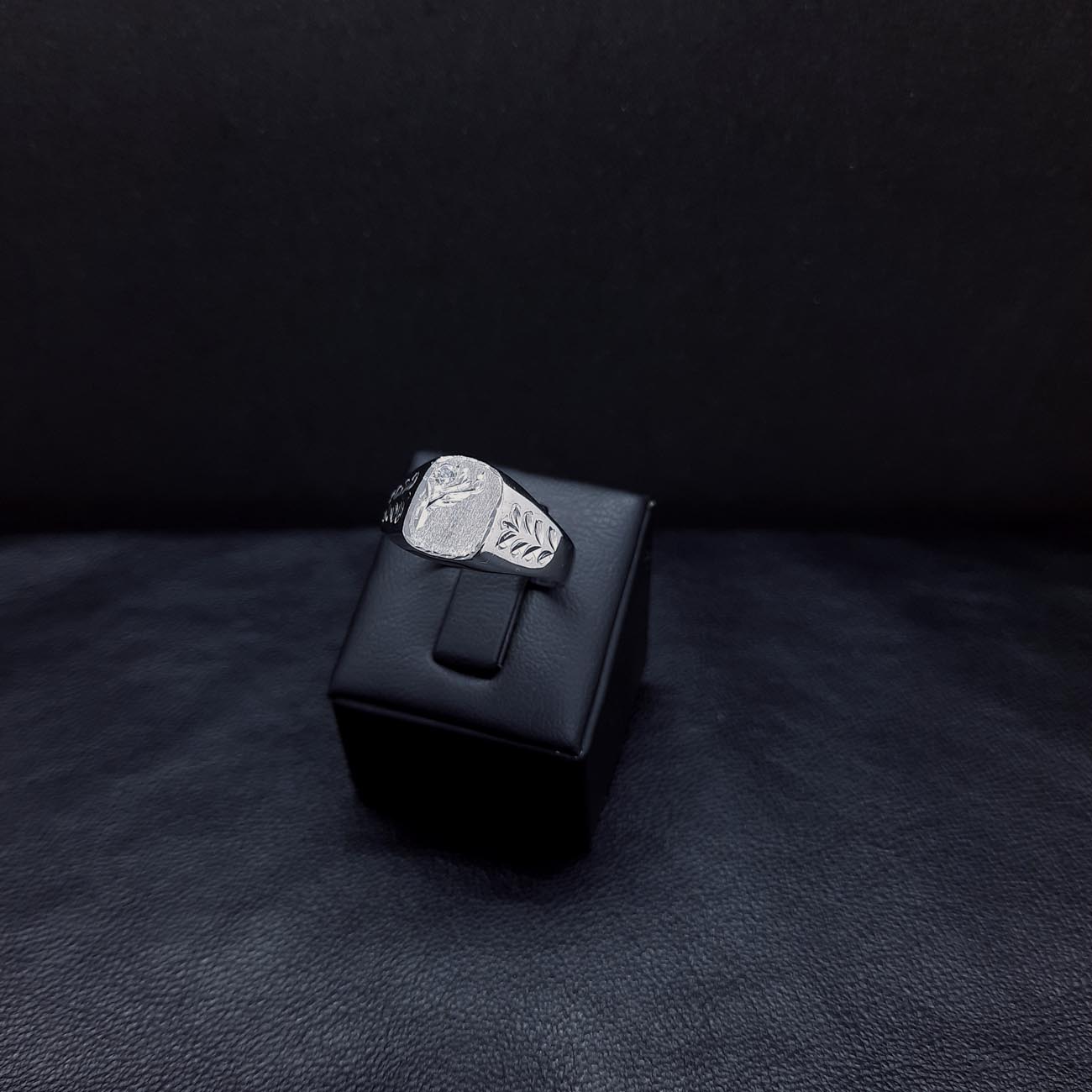 Λευκόχρυσο δαχτυλίδι 14 καρατίων, με υπέροχες σκαλιστές όψεις και ένα διακριτικό τριαντάφυλλο στην μπροστινή ζαγρέ όψη του, πολύ καλοδουλεμένο, για τον άντρα που δεν διστάζει να συνδυάσει δύναμη με ρομαντισμό.