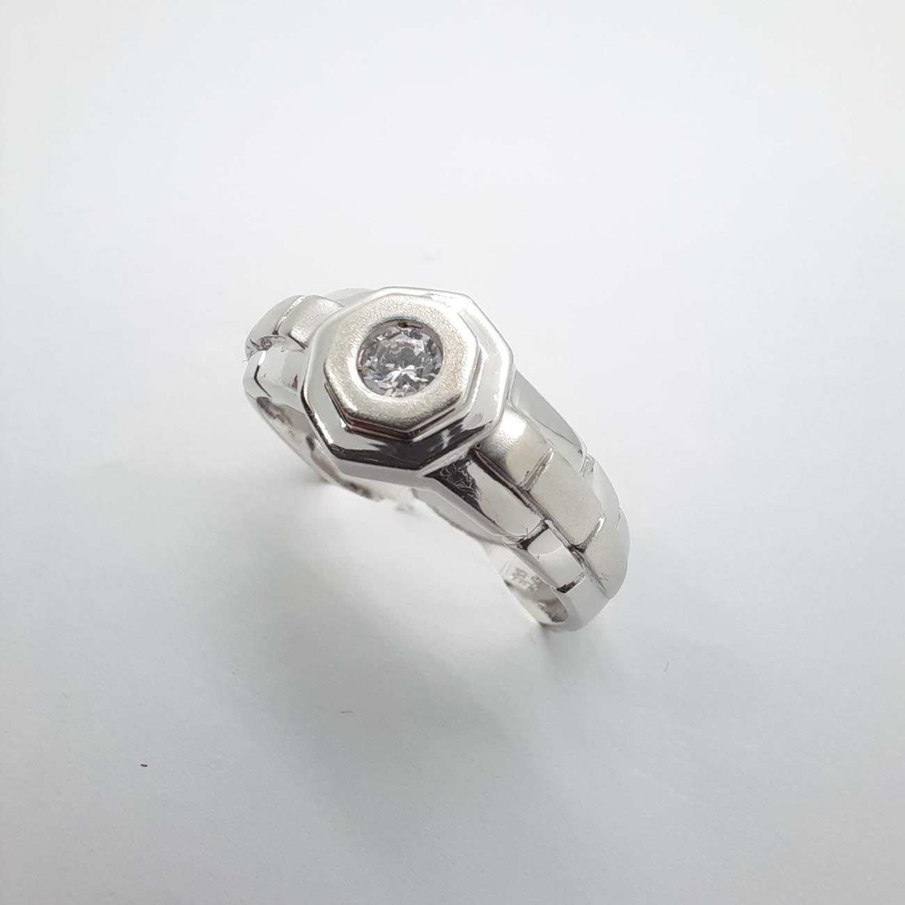 Απίστευτης ομορφιάς αντρικό δαχτυλίδι από λευκόχρυσο 14 καρατίων, καταπληκτικό design, με κεντρικό λευκό ζιργκόν σε 7γωνο διπλό καστόνι, γυαλιστερό και ματ, εξαιρετική επεξεργασία, για τον άντρα παλαιάς κοπής και καλού γούστου, ιδανικό δώρο αρραβώνα , γάμου, κουμπάρου.