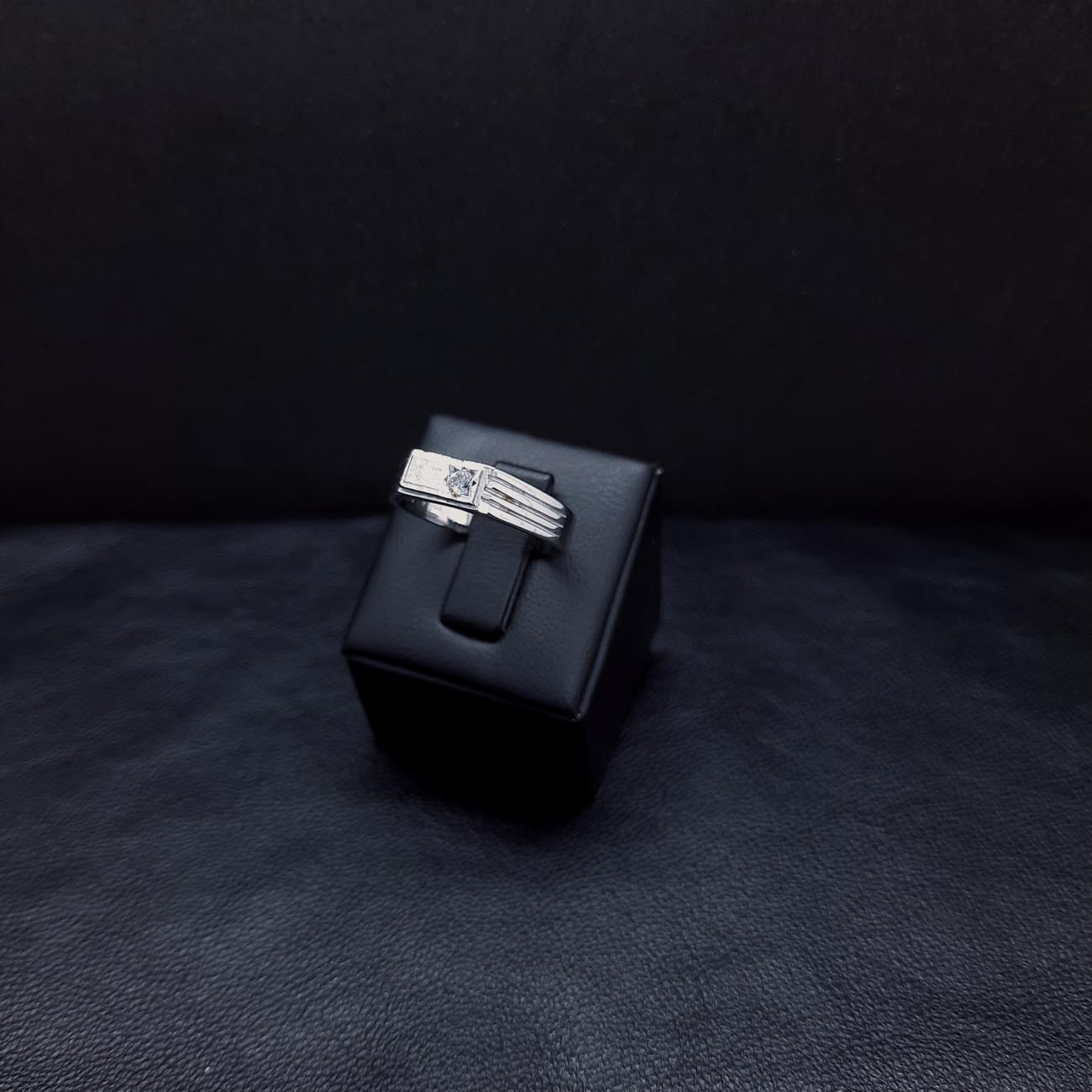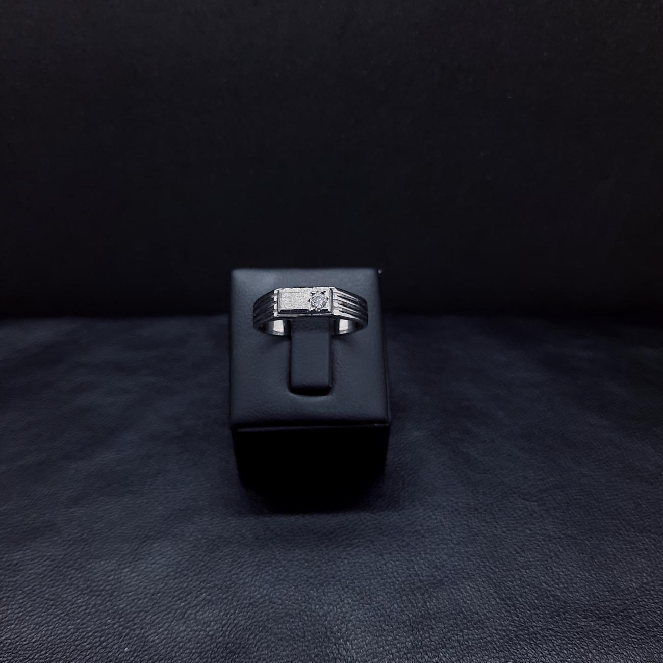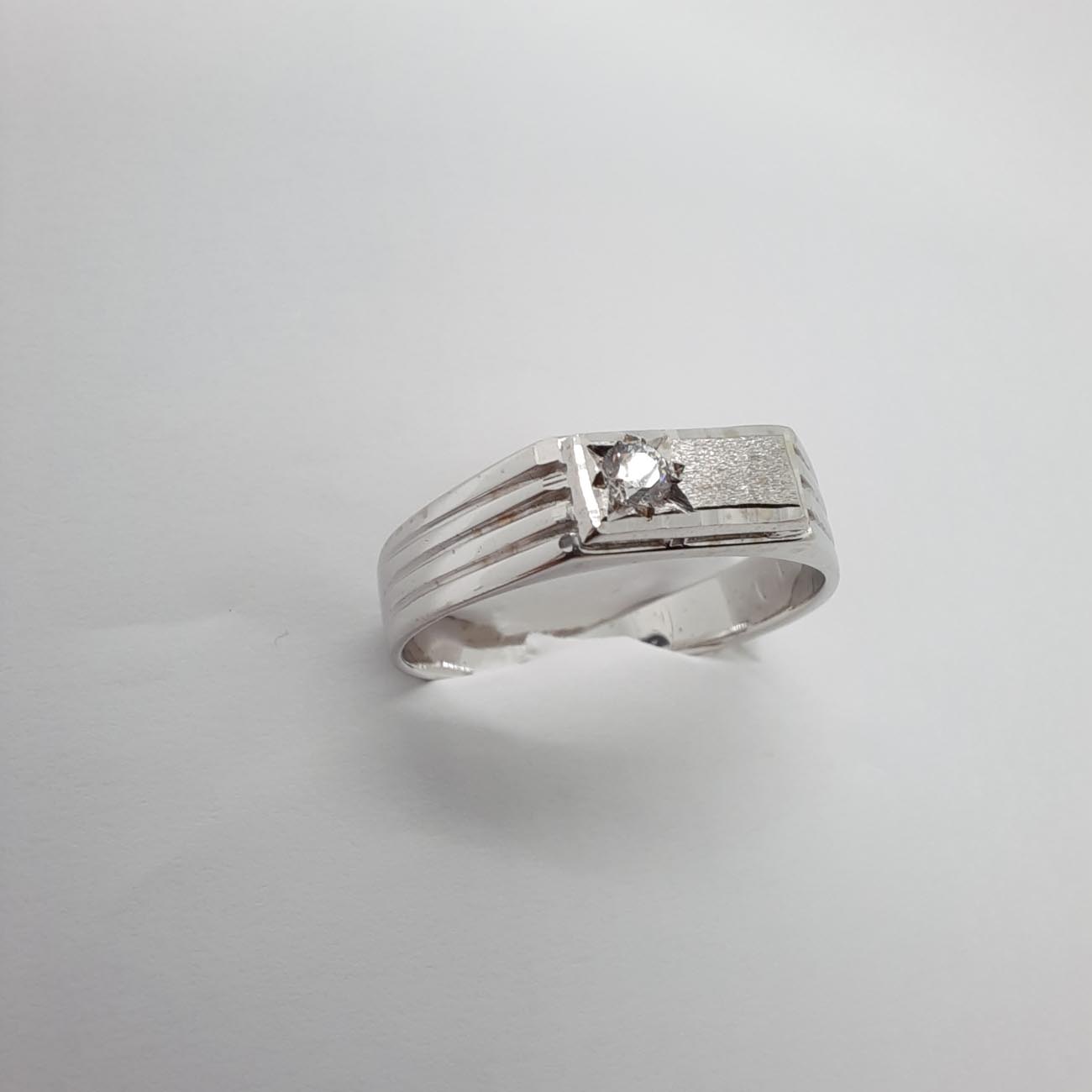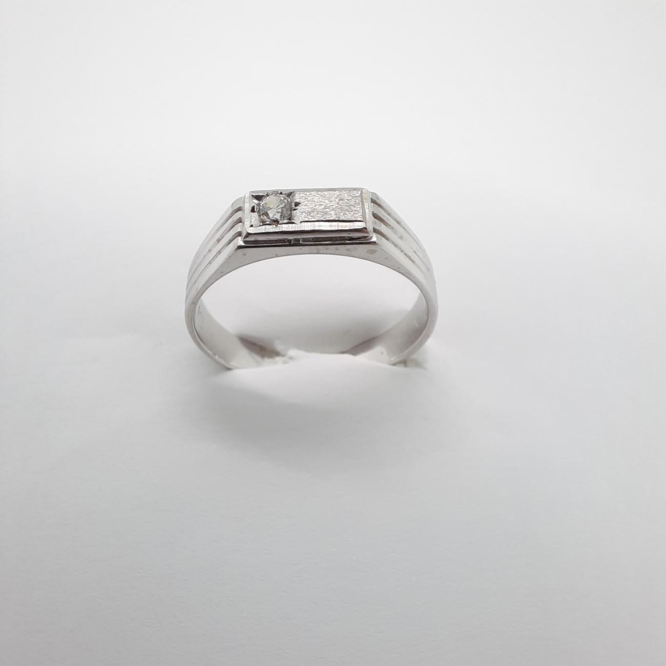 Λευκόχρυσο διακριτικό αντρικό δαχτυλίδι 14 καρατίων με λευκό ζιργκόν στην μπροστινή ματ όψη του και ωραίες χαράξεις στις πλαϊνές πλευρές του, ένα πολύτιμο δώρο αγάπης και αφοσίωσης που τιμά τον άντρα που θα το αποκτήσει.