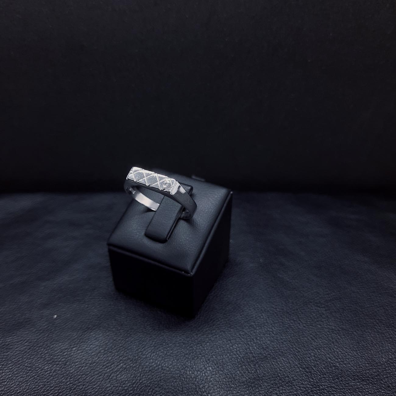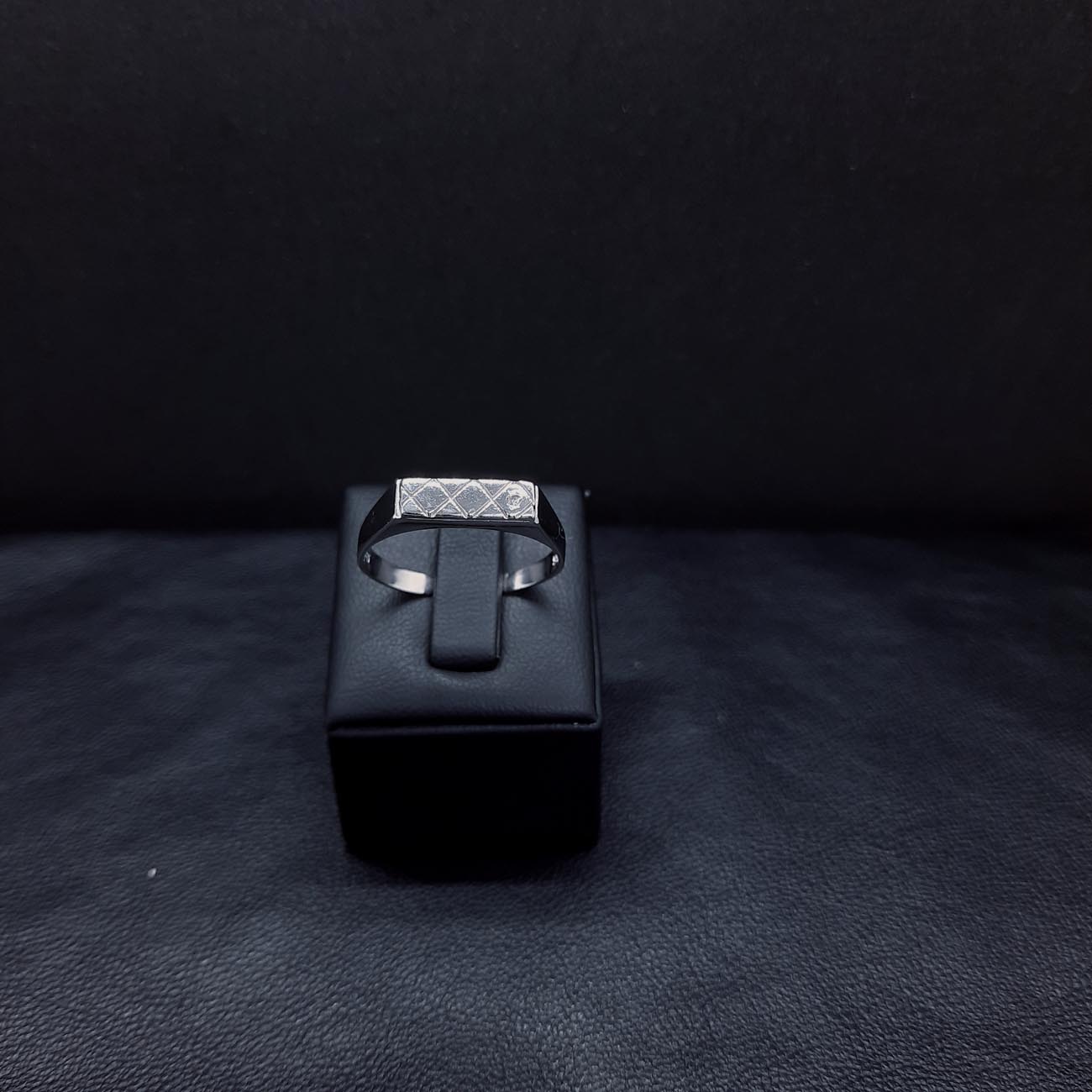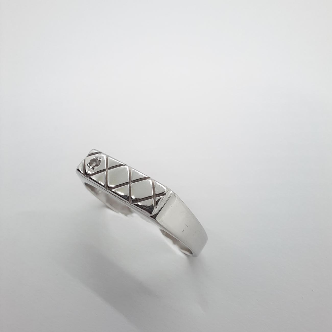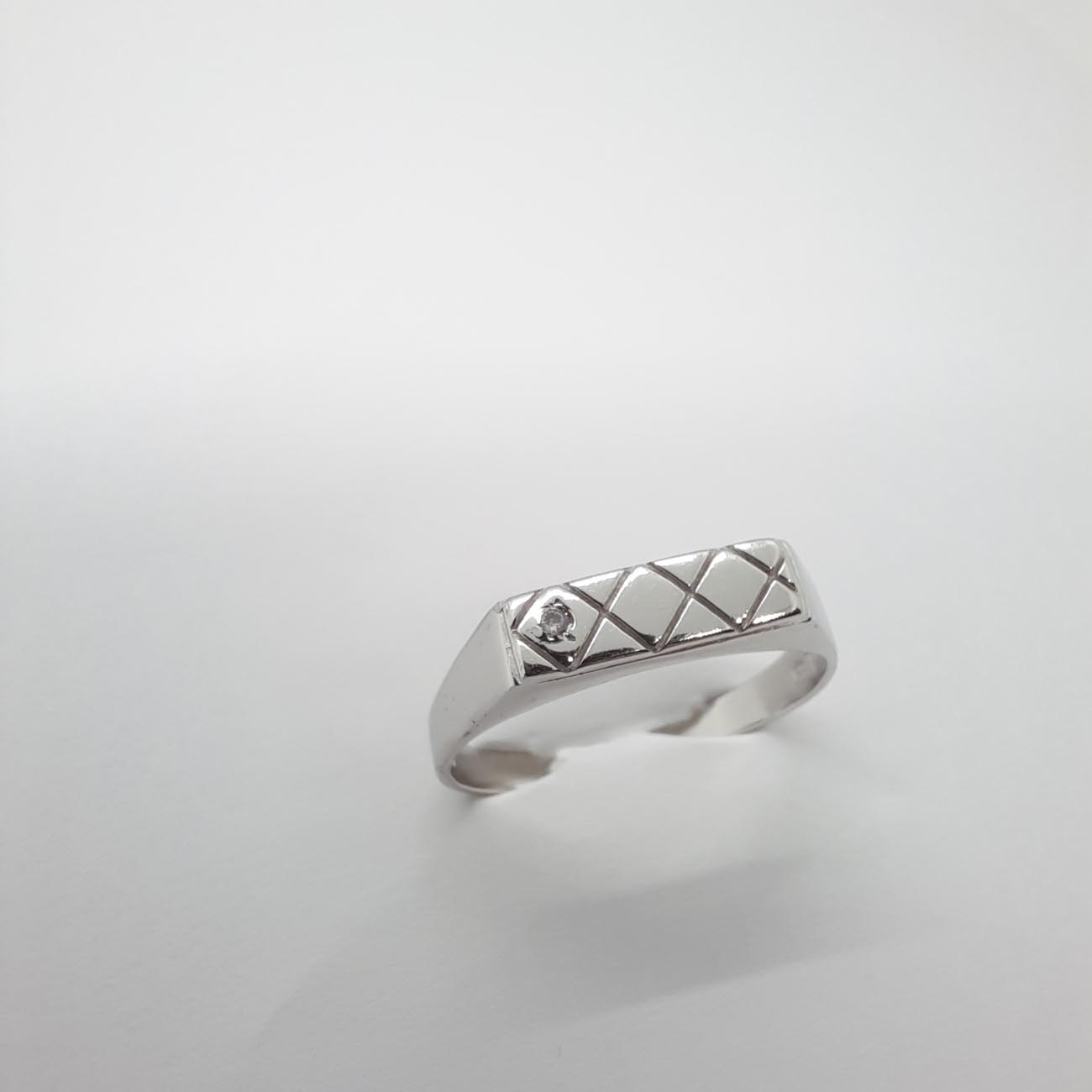 Λευκόχρυσο δαχτυλίδι 14 καρατίων με υπέροχο σκάλισμα με ρόμβους και διακριτικό πλανό ζιργκόν, ιδανικό δώρο για τον άντρα που ξέρει να εκτιμά το ωραίο.