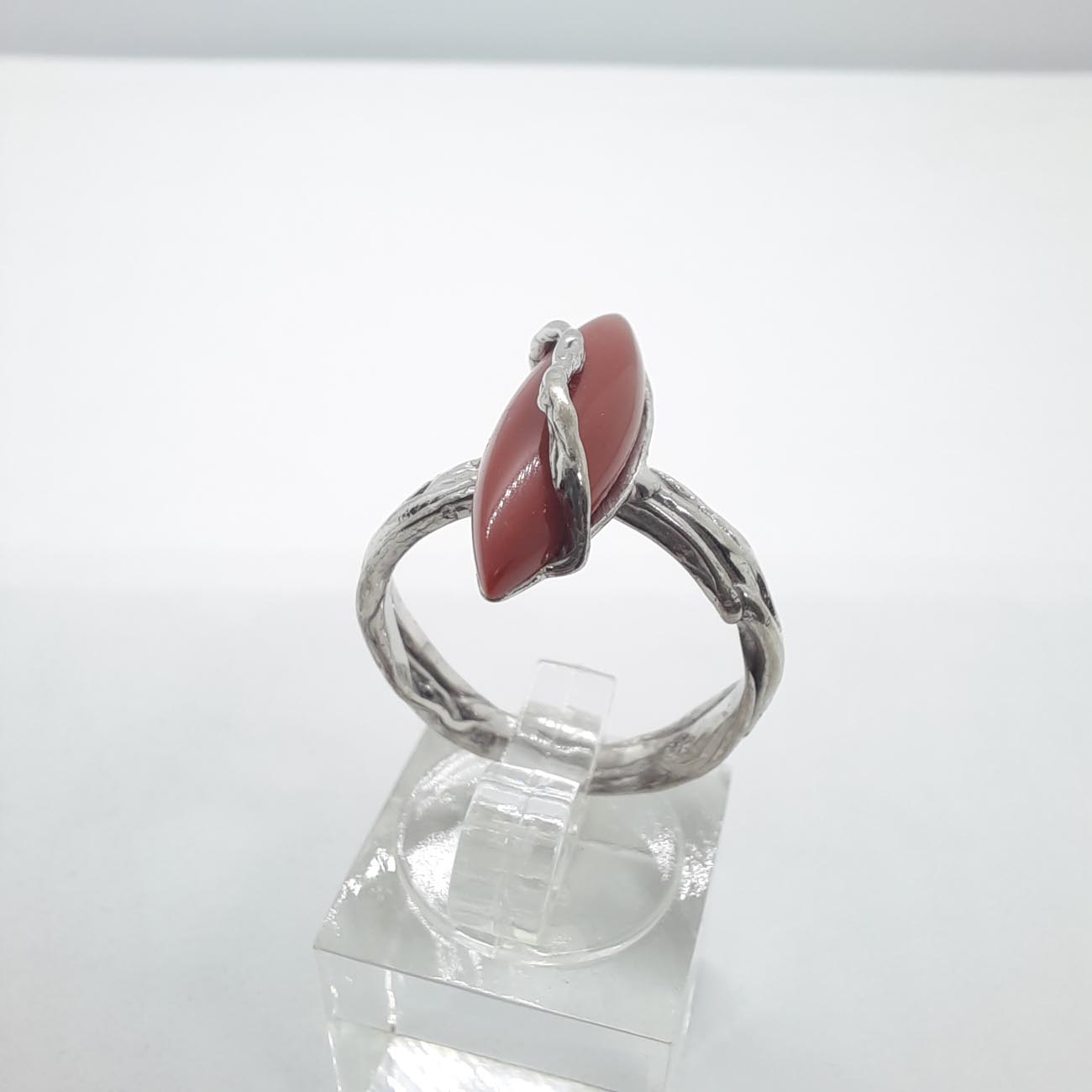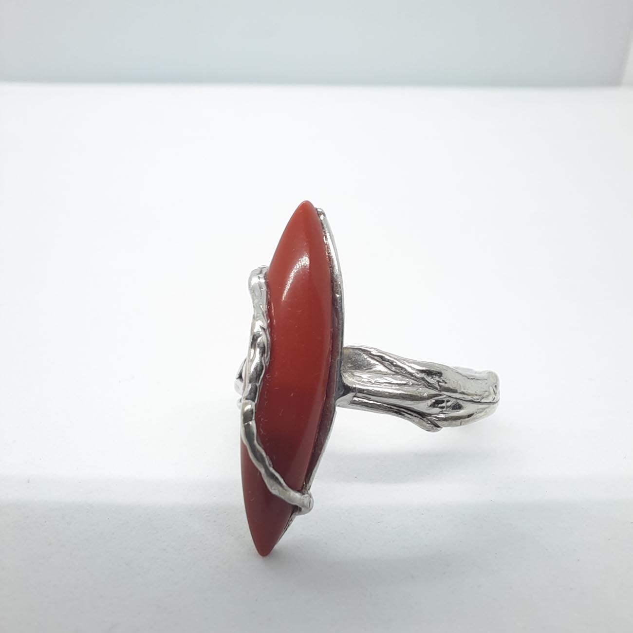 Ένα εντυπωσιακό δαχτυλίδι, από ασήμι, με ιδιαίτερο σκάλισμα και κοράλι, μια δημιουργία που φοριέται όλες τις εποχές και εκφράζει μια καλλιτεχνική προσωπικότητα.