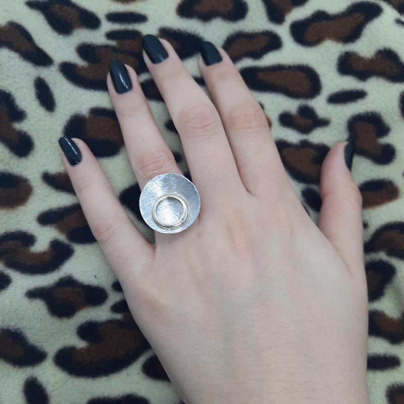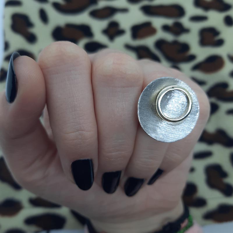 Το ιδανικό δώρο για την νέα μοντέρνα μανούλα! Δαχτυλίδι από ασήμι, εντυπωσιακό μέγεθος, με σύμβολο μητρότητας έναν πελώριο κύκλο αγάπης από σαγρέ επιφάνεια που περικλείει έναν μικρότερο από επιχρυσωμένο ασήμι.