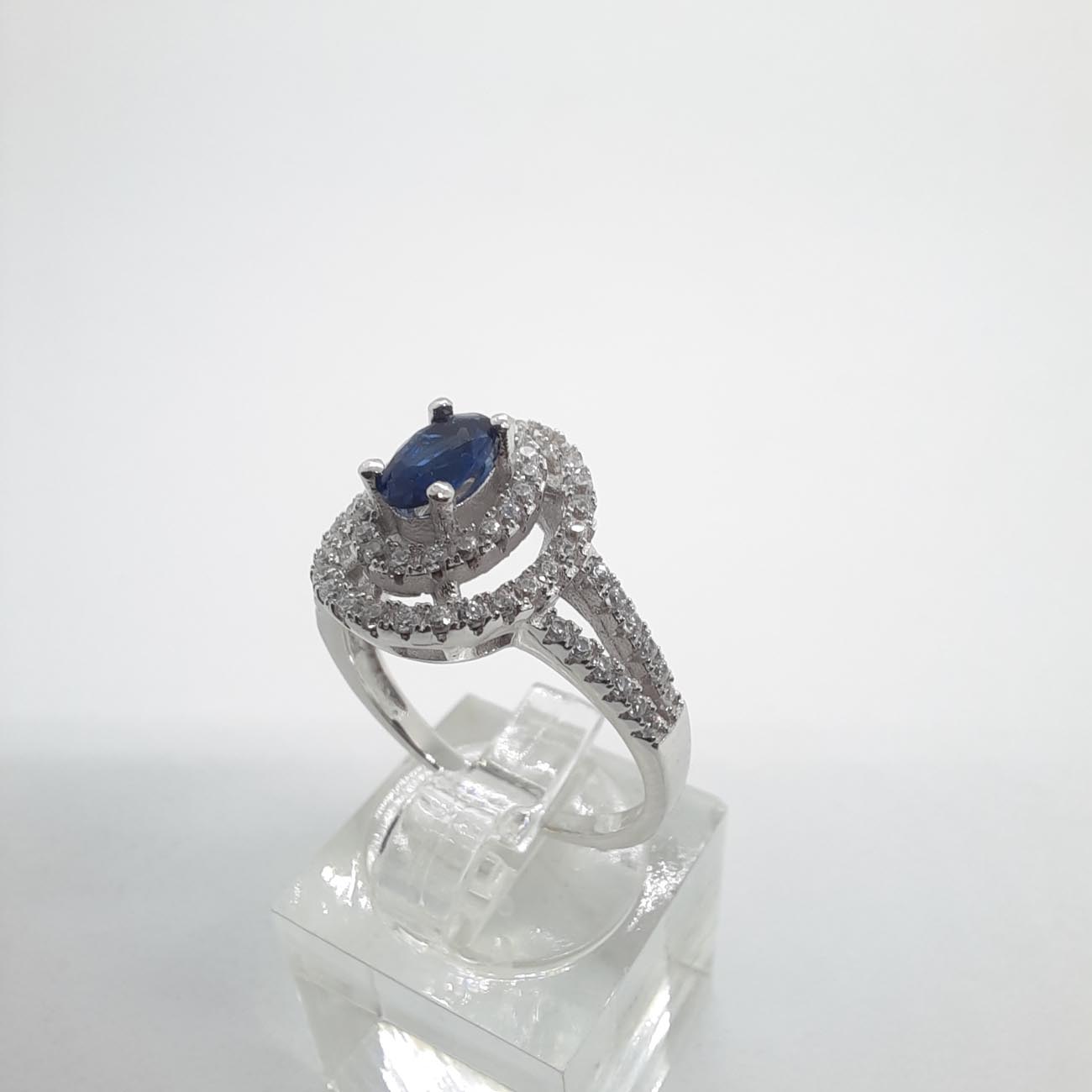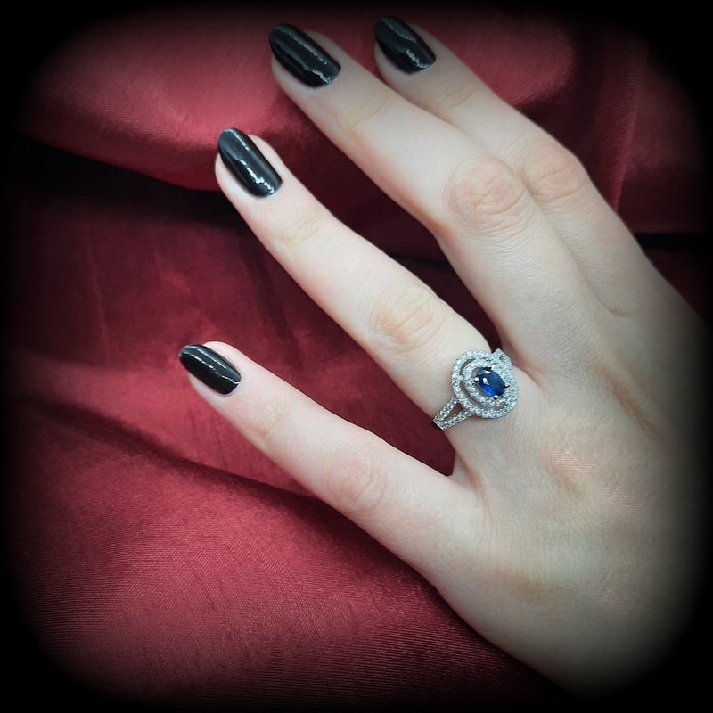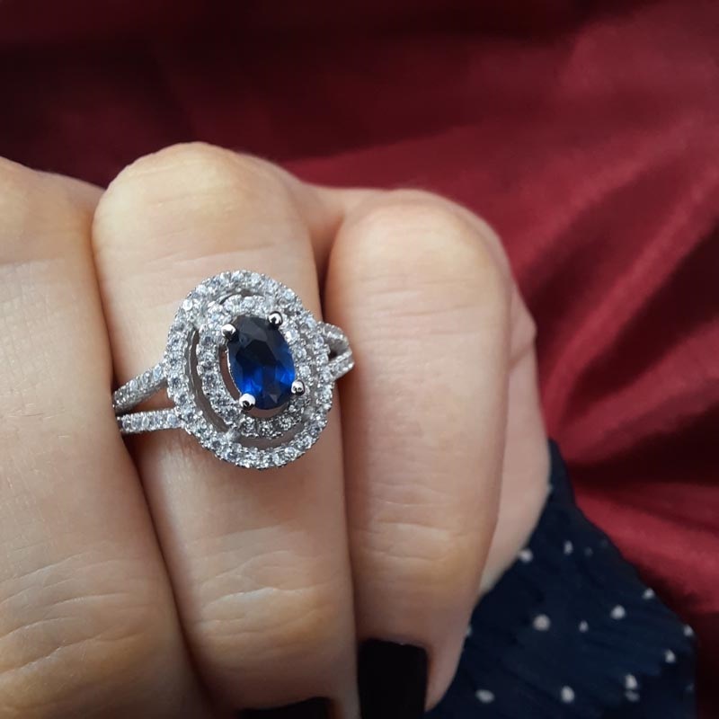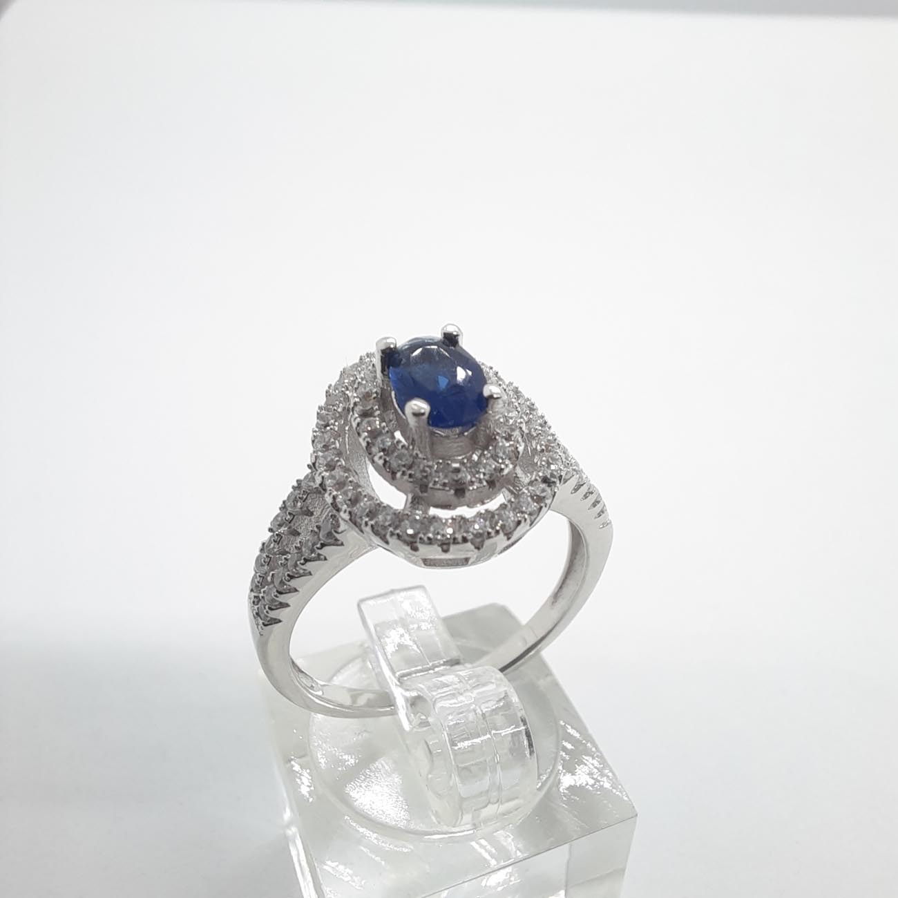 Ένα ρομαντικό κόσμημα για την γυναίκα που λατρεύει την Χολυγουντιανή πολυτέλεια! Με εντυπωσιακό οβάλ ζιργκόν σε σκούρο μπλε της νύχτας, περιτριγυρισμένο από αμέτρητα λευκά μικρά ζιργκόν τοποθετημένα σε δύο ξεχωριστά οβάλ καστόνια. Λευκά ζιργκόν επίσης στολίζουν και τα μισά των δύο πλευρών.