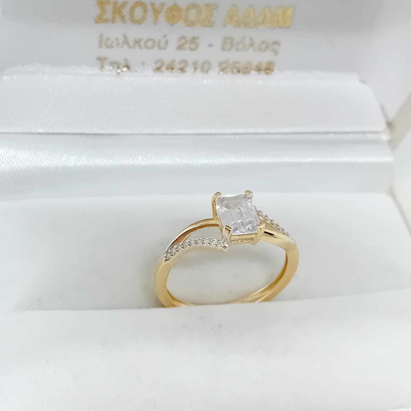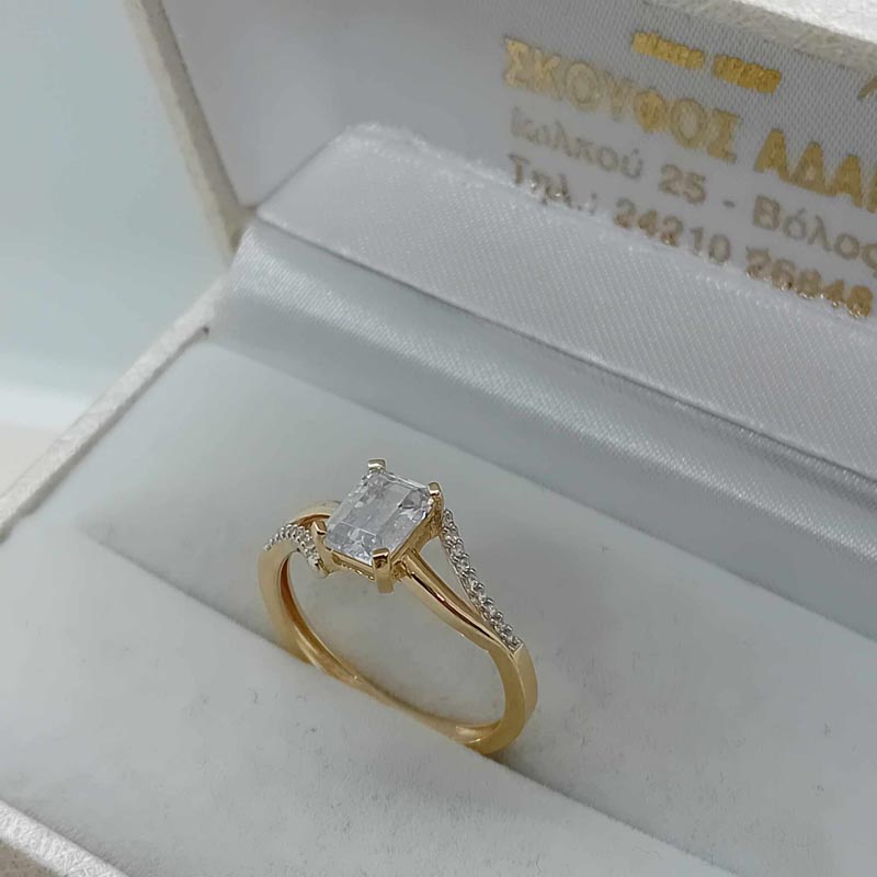 Η ιδανική επιλογή για μια υπέροχη πρόταση γάμου! Πολύτιμο δαχτυλίδι αρραβώνων, χρυσό μονόπετρο 14 ΚΑΡΑΤΙΩΝ, με ορθογώνιο κεντρικό ζιργκόν, περίτεχνο design με μικρά διακριτικά ζιργκόν εκατέρωθεν και σχετικά φαρδιά γάμπα.