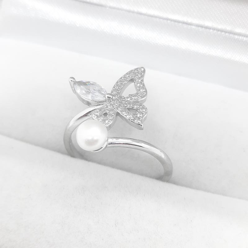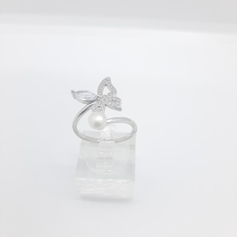 Ρομαντικό δαχτυλίδι ασήμι 9.25 με μοντέρνο design, που ανοίγει μπροστά, με εντυπωσιακή πεταλούδα στην μια άκρη του, στολισμένη περίτεχνα με ένα μεγάλο διαφανές ζιργκόν σε οβάλ σχήμα και πολλά διακριτικά ζιργκόν στα φτερά της και μια πέρλα στην άλλη άκρη.