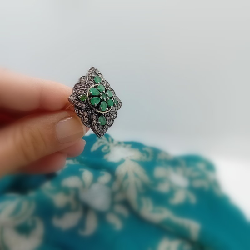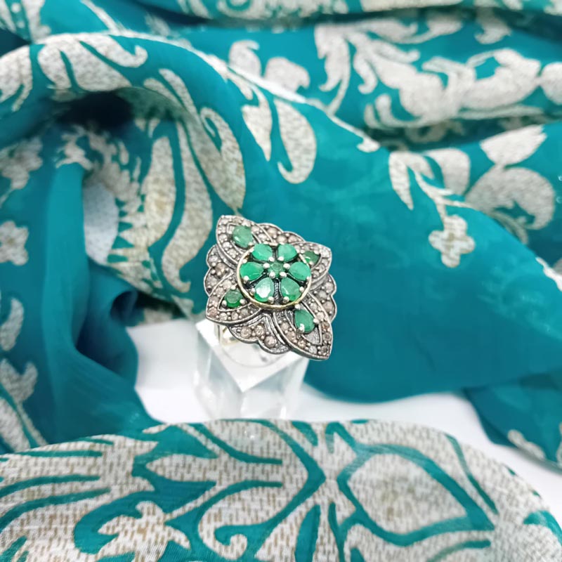 Αρχοντικό δαχτυλίδι μεγάλο και εντυπωσιακό σε στυλ ΓΙΑΝΝΙΩΤΙΚΟ από ασήμι, ιδιαίτερο σκάλισμα, αστραφτερά ζιργκόν, πράσινο αχάτη που σχηματίζει λουλούδι, με γάμπα από επιχρυσωμέο ασήμι.