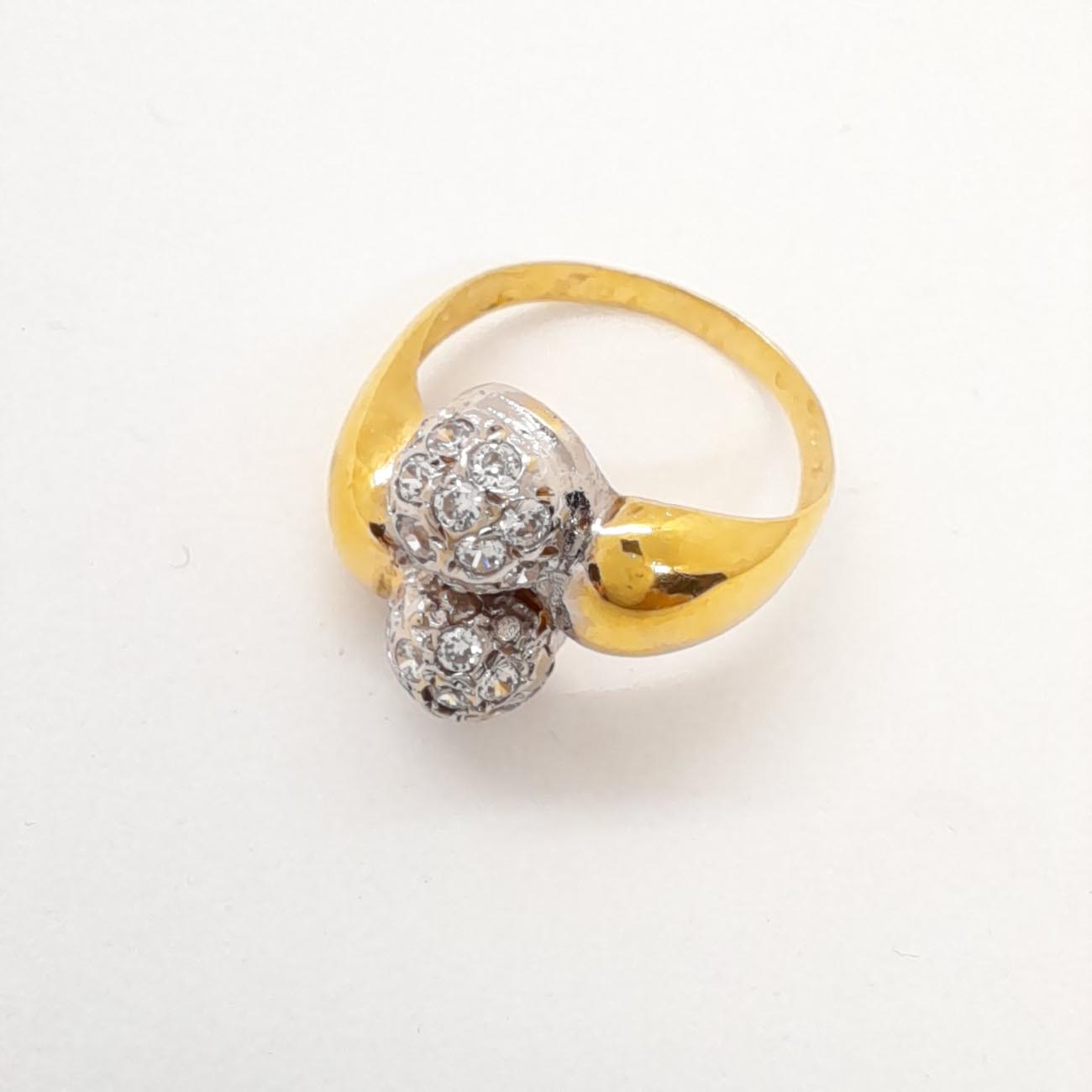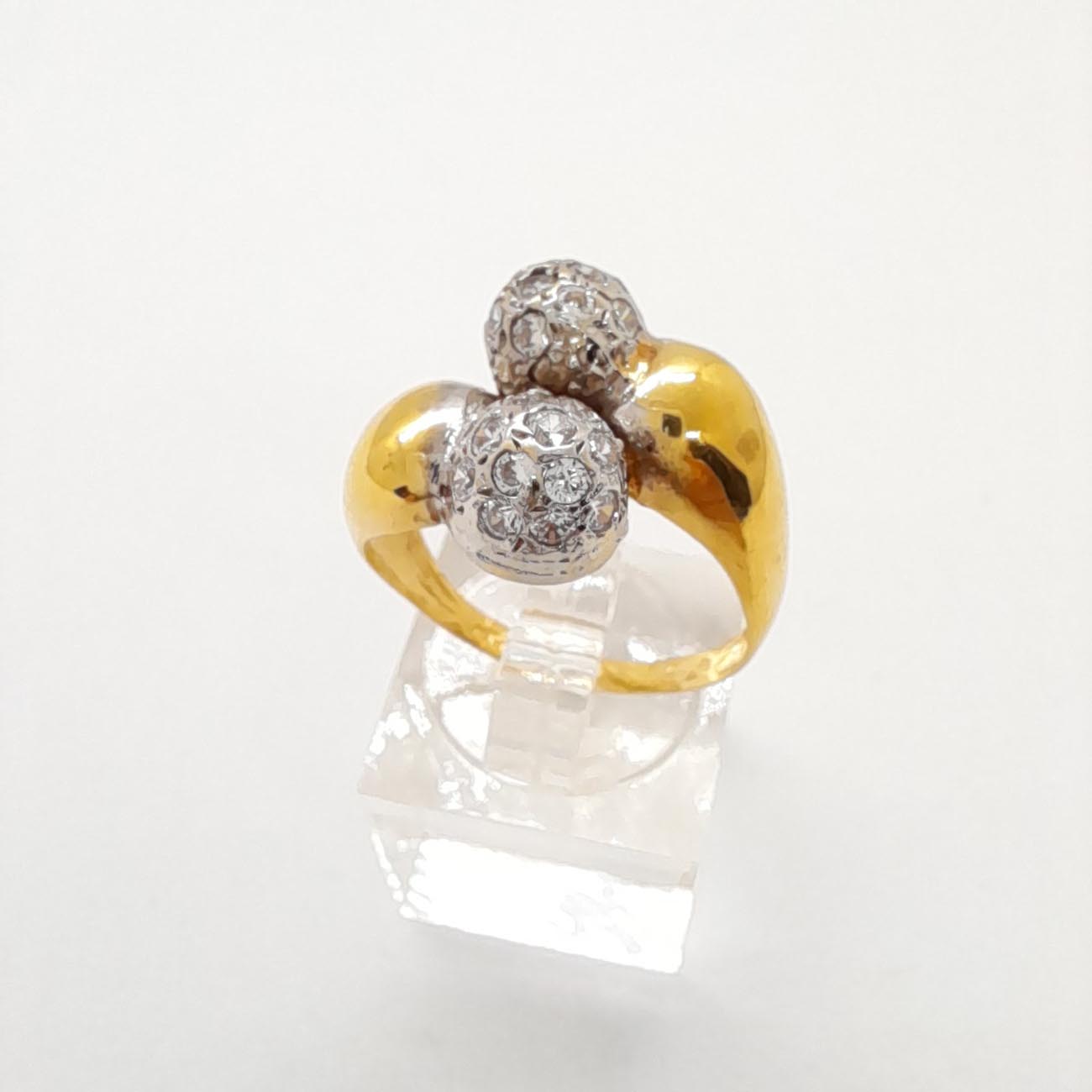 Σύμβολο ένωσης και αγάπης αυτό το χρυσό δαχτυλίδι, από χρυσό 14 καρατίων, με τις 2 γάμπες του με λουστρέ λεία επιφάνεια να αγγίζονται, με δύο μπάλες από λευκά ζιργκόν, ένα κόσμημα διαχρονικής ομορφιάς και αξίας.
