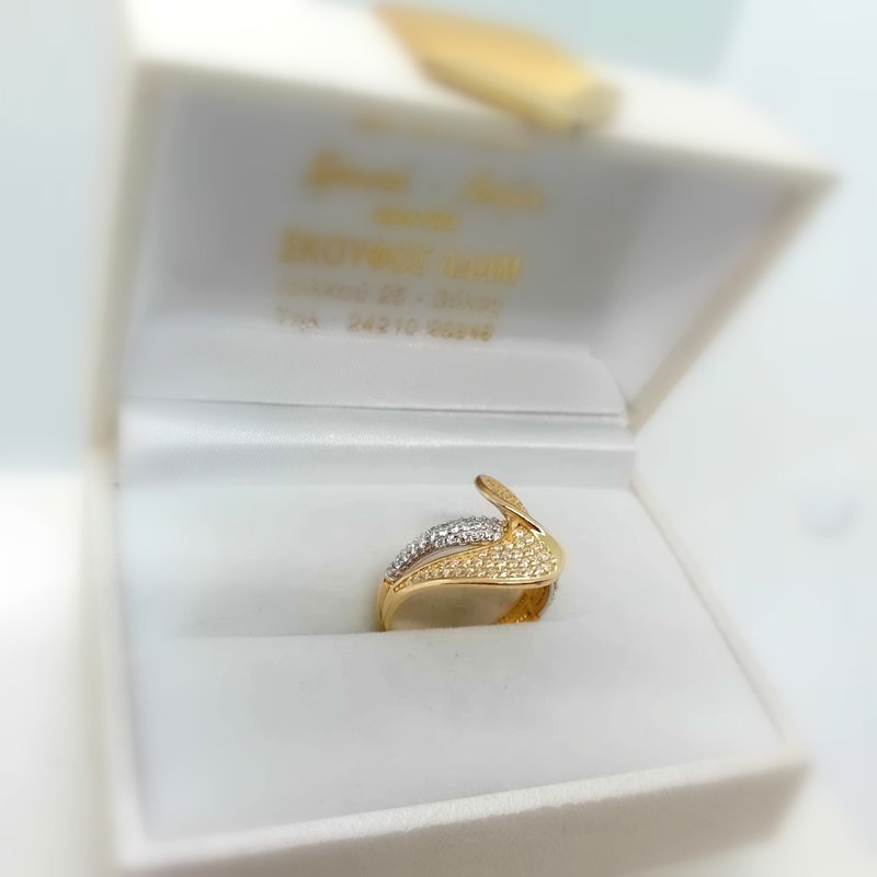 Μεγαλοπρεπές δαχτυλίδι , πρωτοτυπία στο design, χρυσό 14 καράτια και πληθώρα ζιργκόν που δημιουργούν ένα αστραφτερό κόσμημα, με λεπτή φινετσάτη γάμπα.