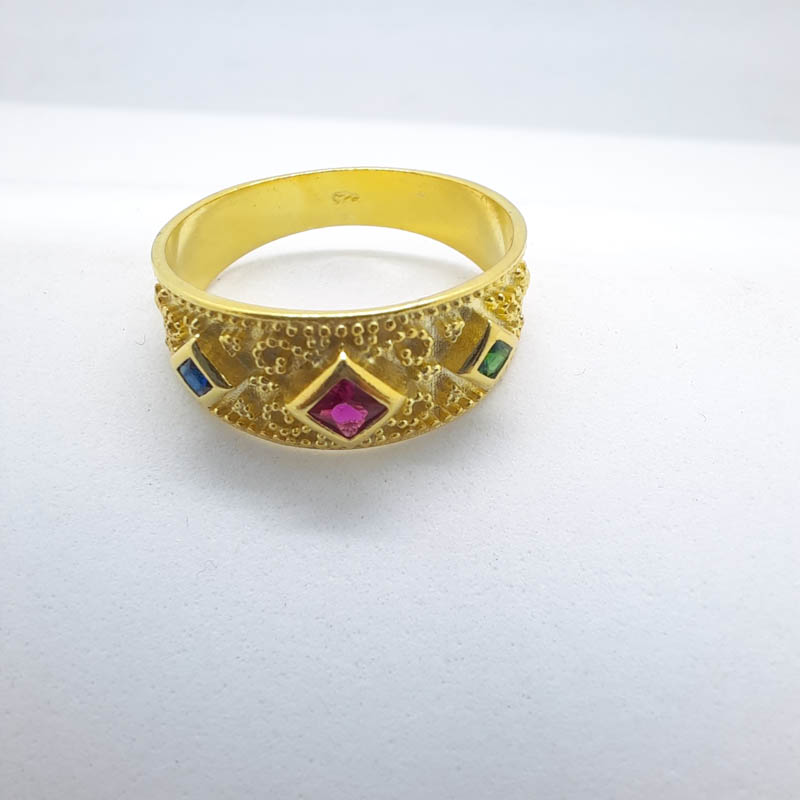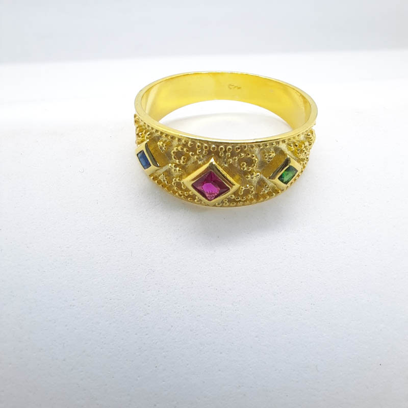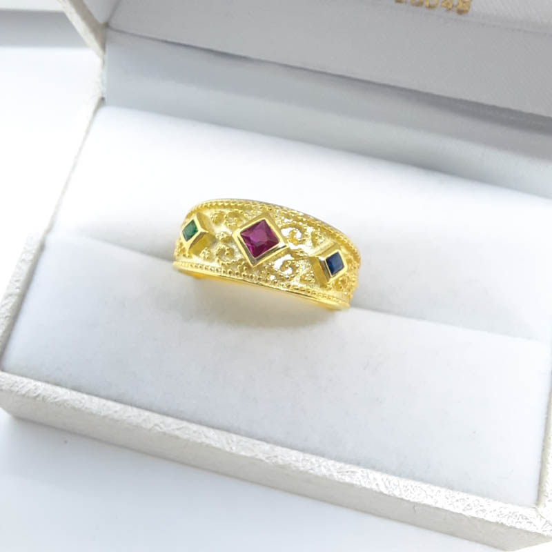 Μεγαλοπρεπές, υπέροχα σκαλισμένο, από ασήμι επιχρυσωμένο και σε εντυπωσιακή φαρδιά γραμμή δαχτυλίδι Βυζαντινής τεχνοτροπίας, με μεγάλο κεντρικό ζιργκόν σε σχήμα ρόμβου και χρώμα κόκκινο σε απόχρωση του ρουμπινιού και δύο μικρότερα ζιργκόν, το ένα σε απόχρωση πράσινη του σμαραγδιού και το άλλο μπλε του ζαφειριού.