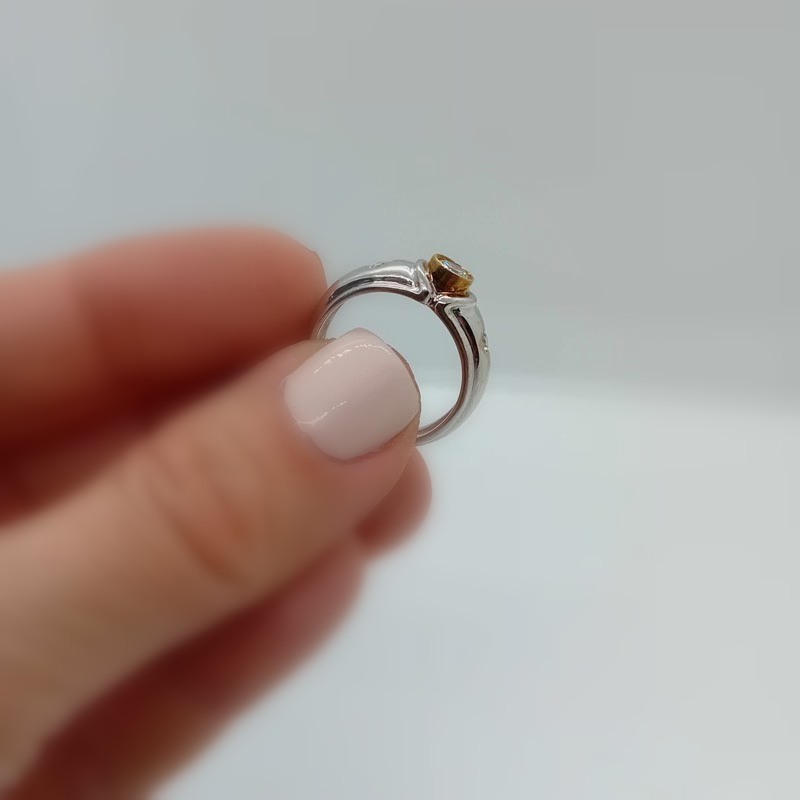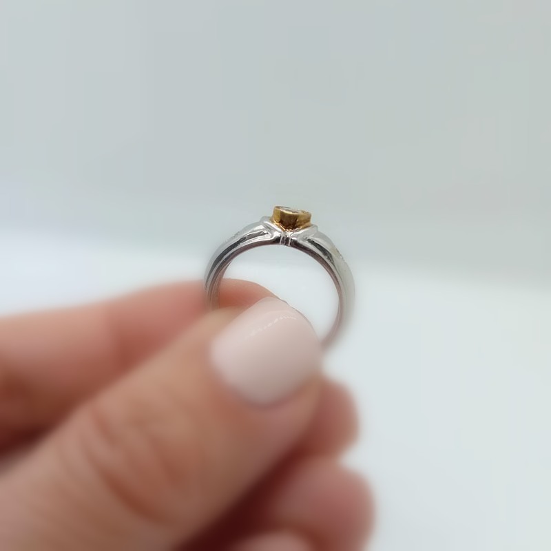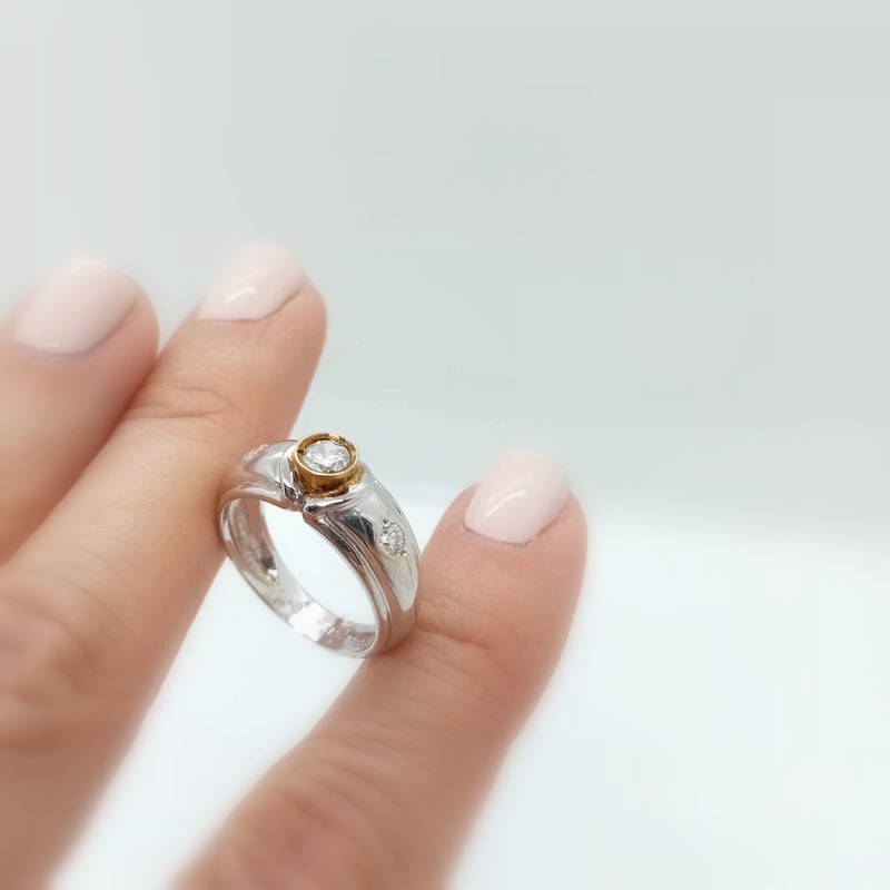 Εξαιρετικά εντυπωσιακό δαχτυλίδι από λευκόχρυσο 14 καρατίων, με πλούσια φαρδιά "γάμπα" , δύο ευδιάκριτα πλαϊνά λευκά ζιργκόν και ένα μεγάλο ζιργκόν καρφωμένο με το χέρι μέσα σε ολόχρυσο στρογγυλό καστόνι σε κίτρινη απόχρωση του χρυσού.Ένα κόσμημα ζωής για την γυναίκα που αγαπά τον ρεαλισμό και δεν φοβάται να προβάλλει τον δυναμισμό της.