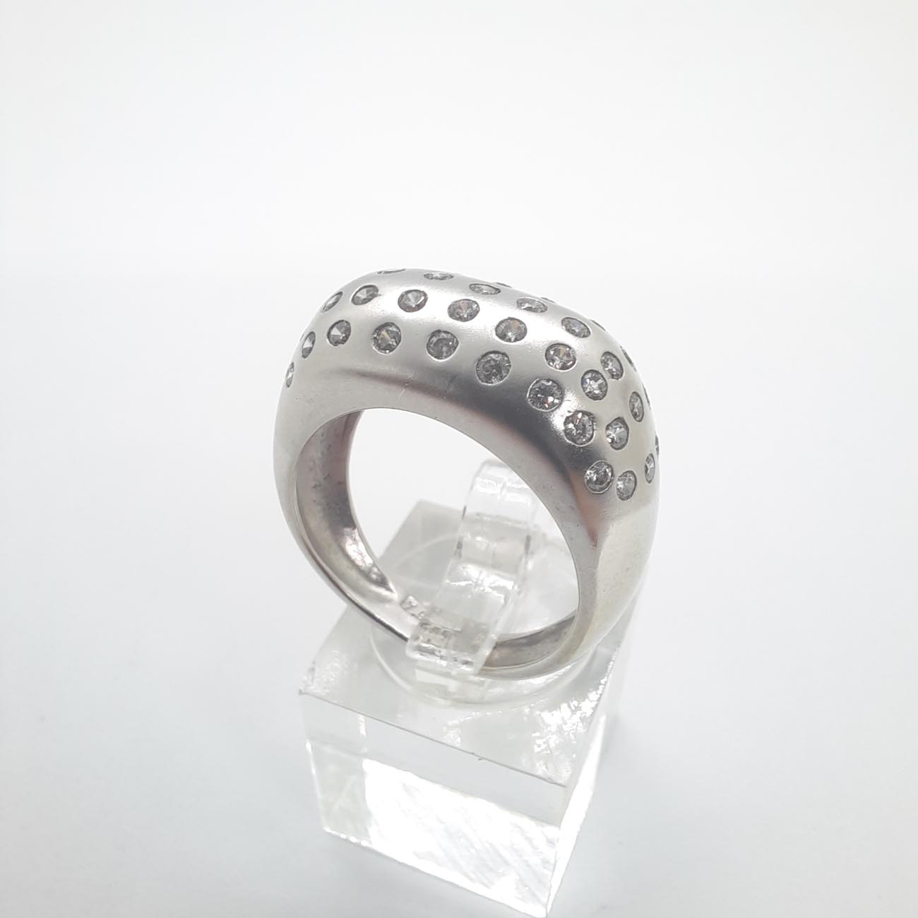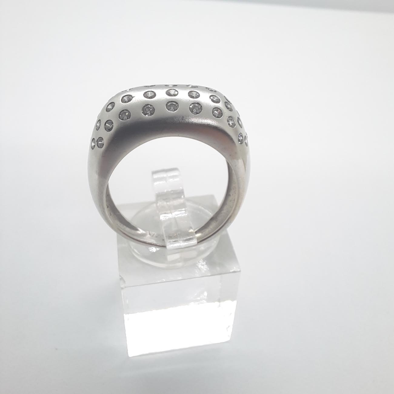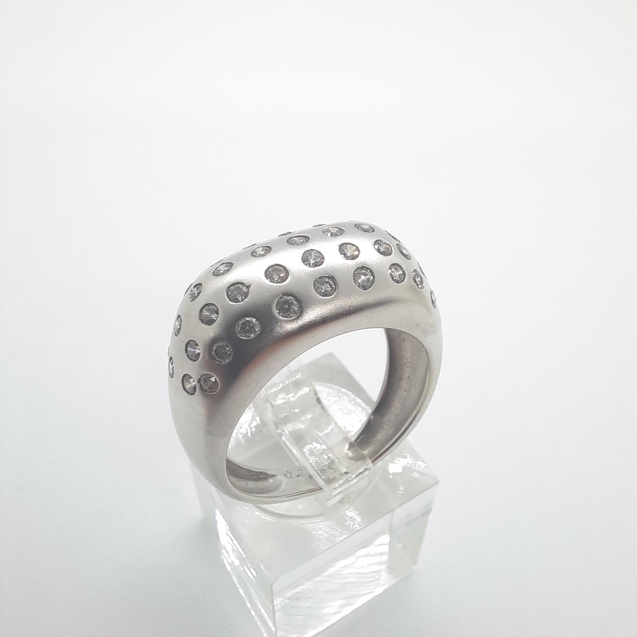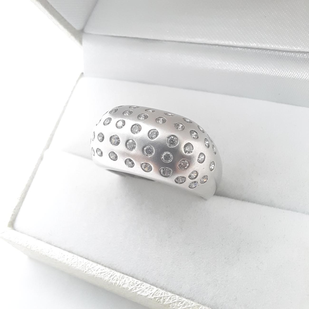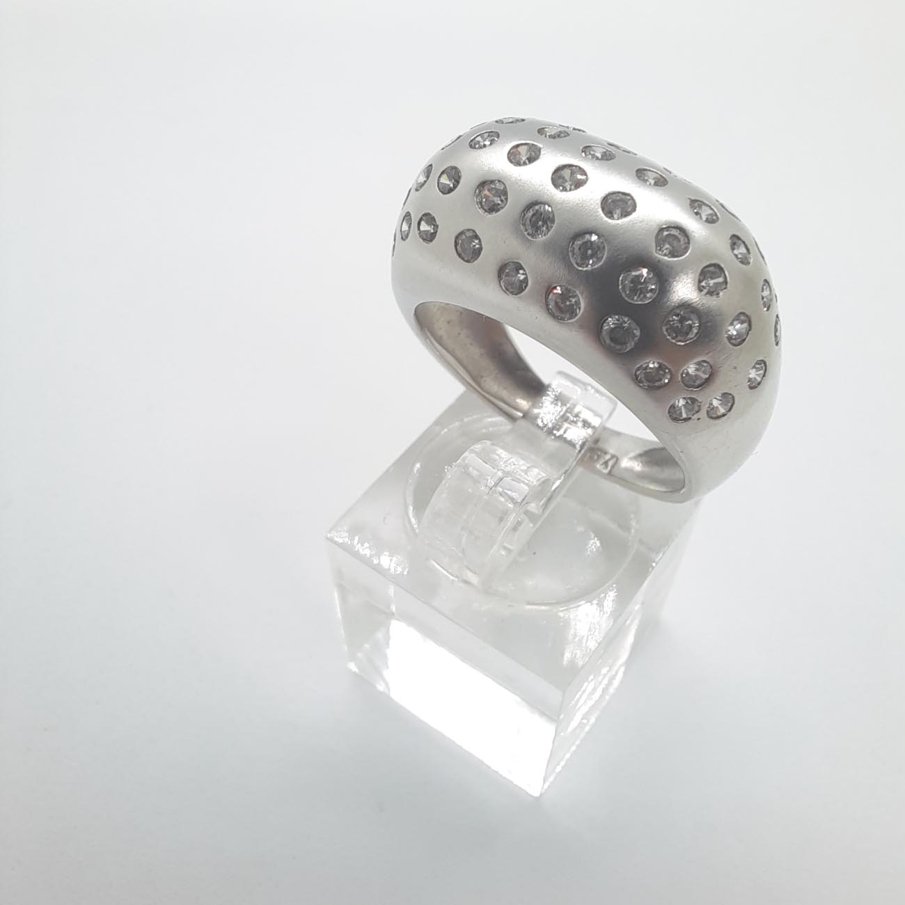 Ένα πολύ εντυπωσιακό βαρύτιμο κόσμημα για μια μοναδική γυναίκα από λευκόχρυσο 14 καράτια. Στην μπροστινή ματ όψη του υπάρχουν 5 σειρές λευκών ζιργκόν καρφωμένα με το χέρι ώστε να δημιουργούν μια λεία επιφάνεια και οι γάμπες είναι λουστρέ και αστραφτερές. Εκπέμπει δυναμισμό και ταυτόχρονα πολυτέλεια. Ιδανικό δώρο αρραβώνα, γάμου, επετείου.