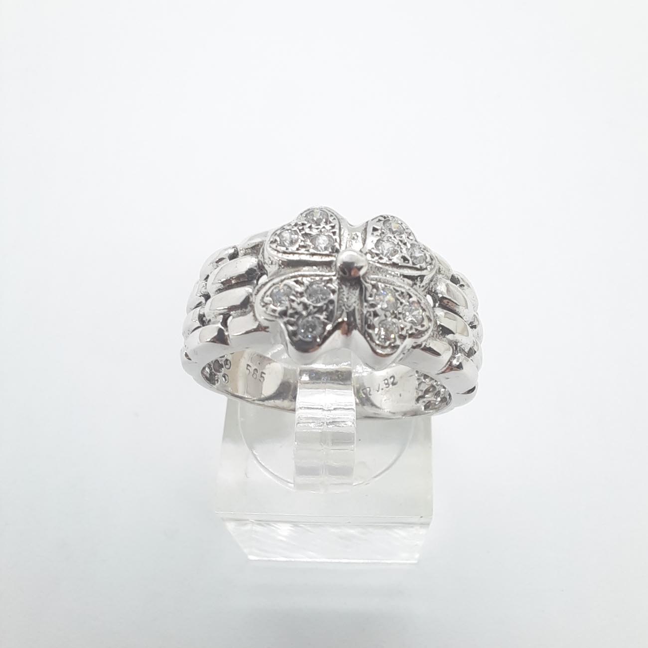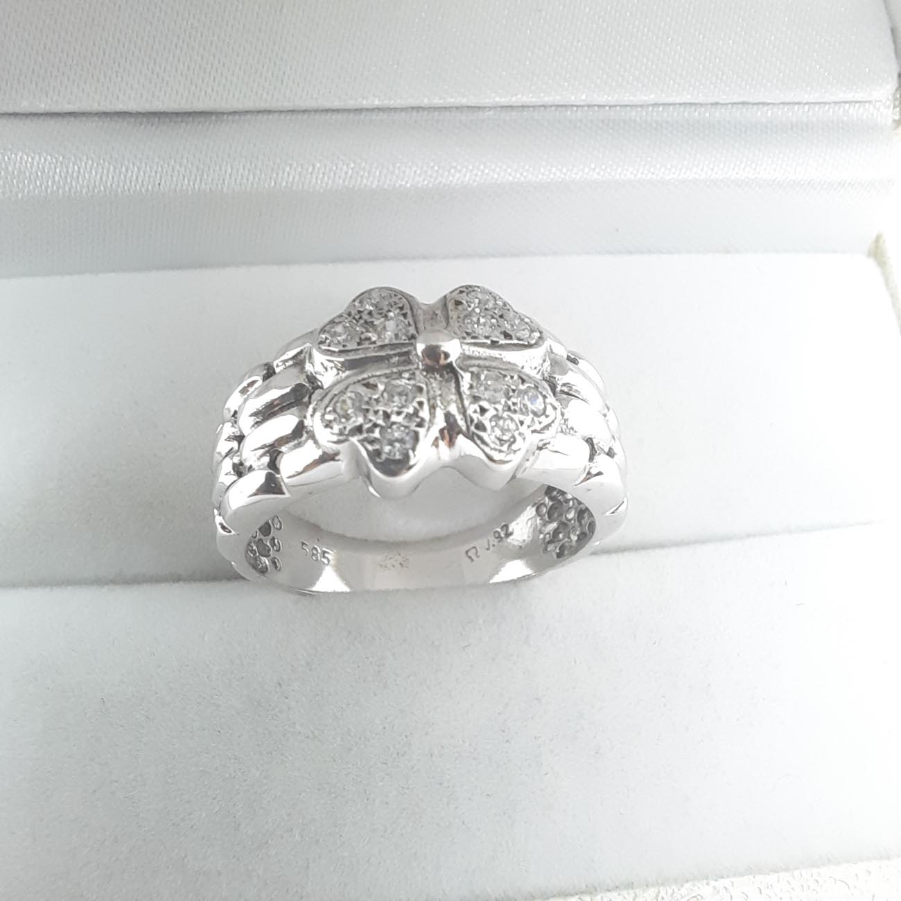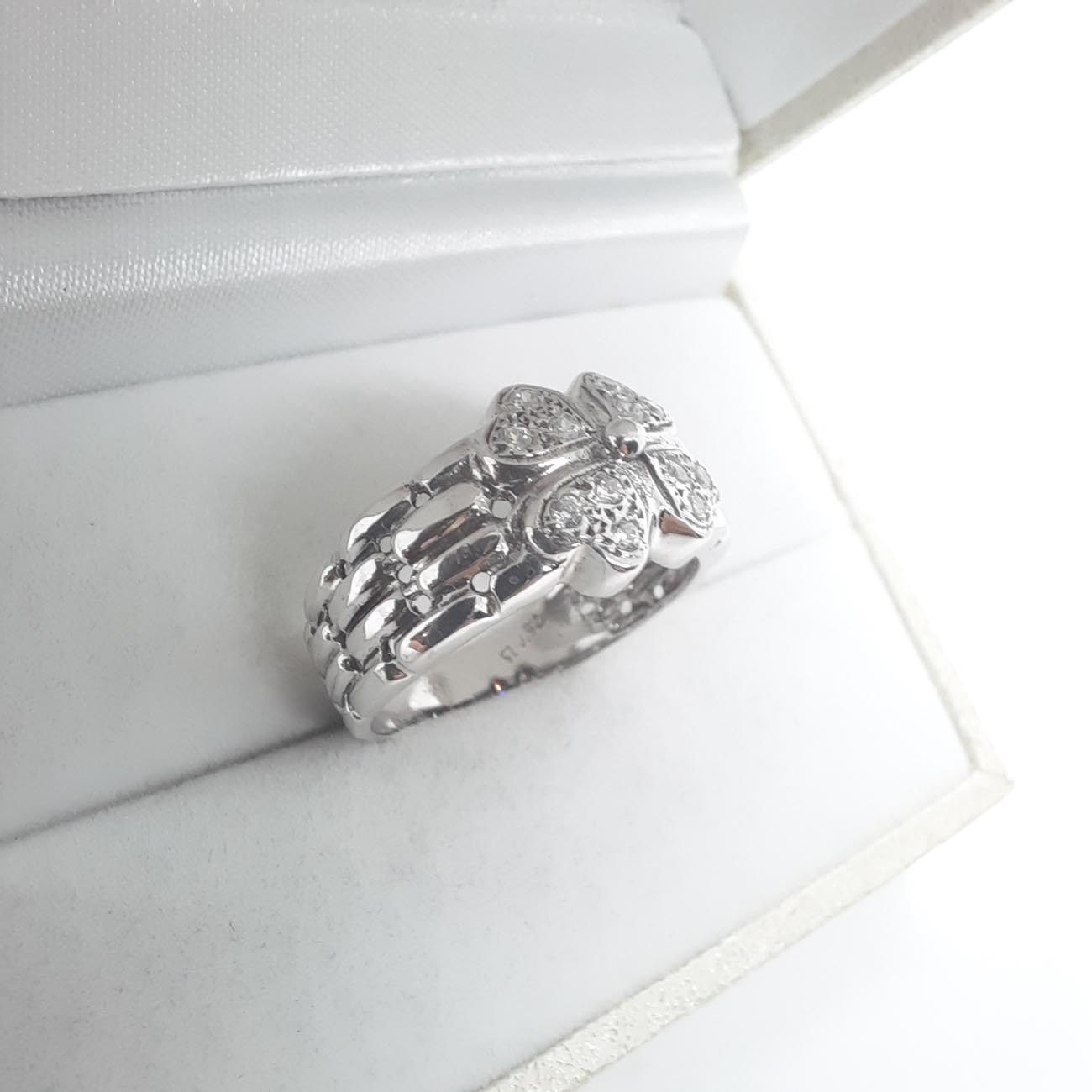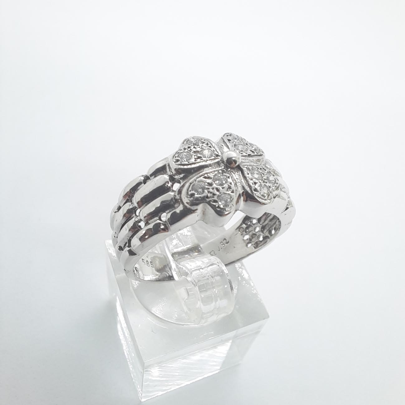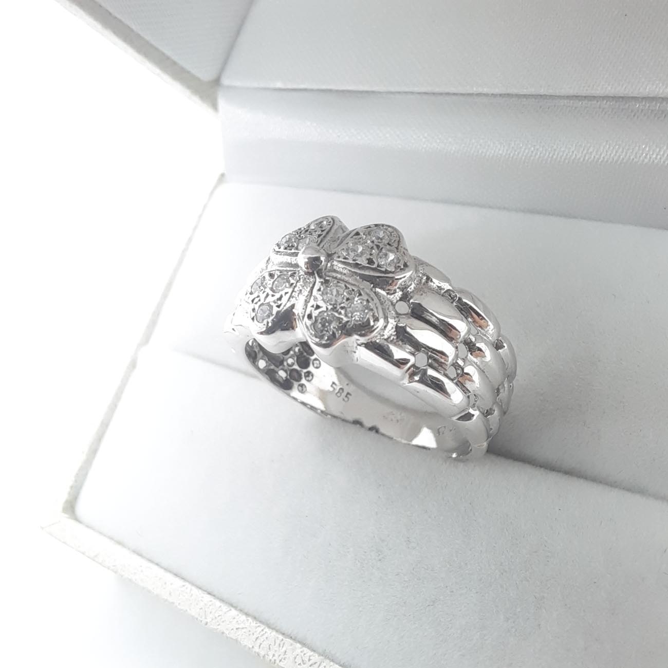 Ένα αριστούργημα κομψότητας και πολυτέλειας στα χέρια μια μοναδικής γυναίκας! Από λευκόχρυσο 14 καράτια, με λεπτομερές σκάλισμα στις γάμπες και με 4 καρδιές με λευκά αστραφτερά ζιργκόν να σμίγουν στο κέντρο του δαχτυλιδιού.