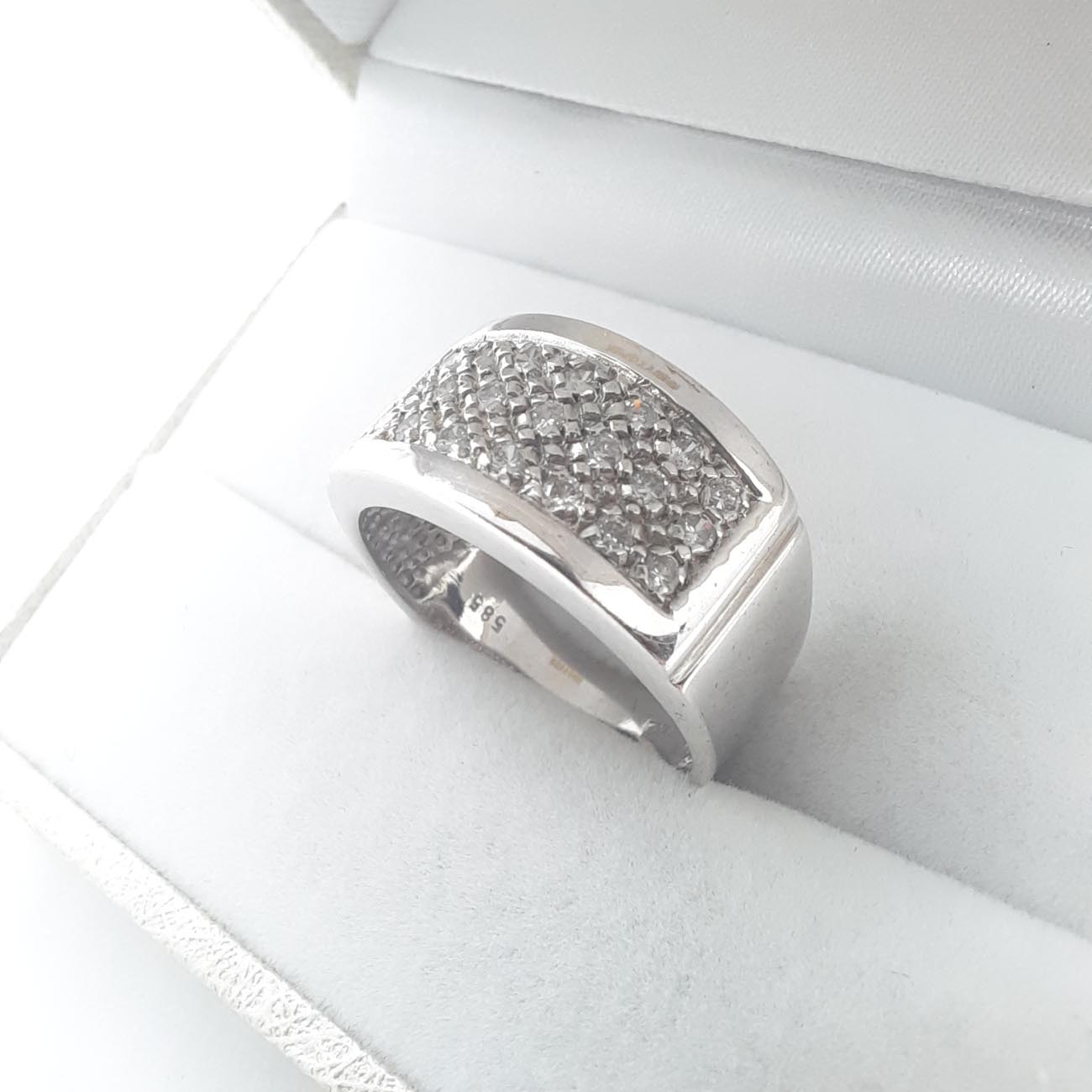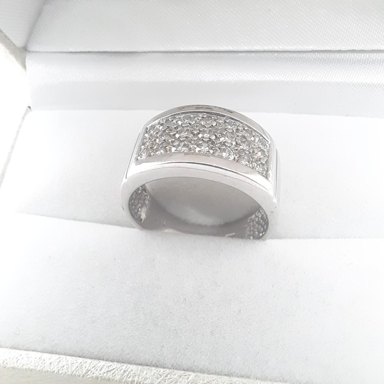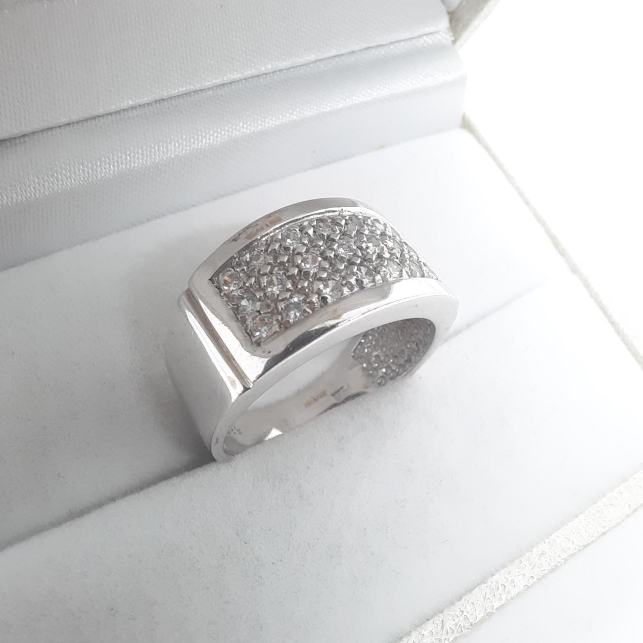 All time classic δαχτυλίδι που προσδίδει κύρος, δυναμισμό και γοητεία στην γυναίκα που το φορά, από λευκόχρυσο 14 καράτια με 3 σειρές υπέροχα λευκά αστραφτερά ζιργκόν και λουστρέ φαρδιά επιφάνεια στις γάμπες του.