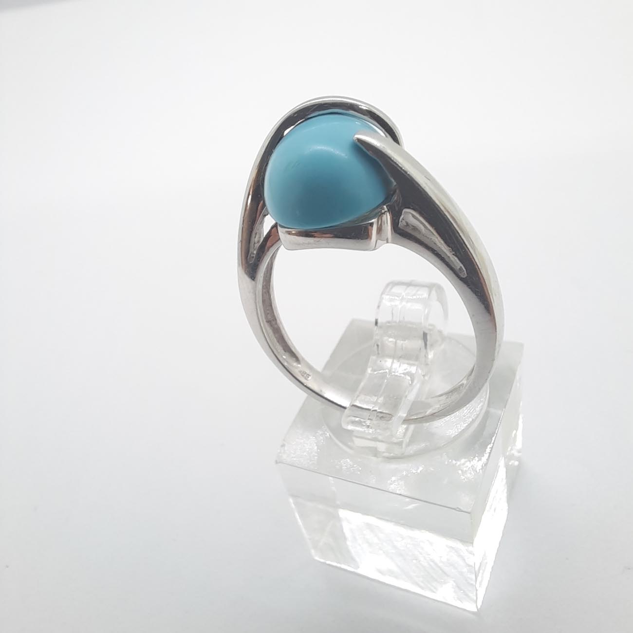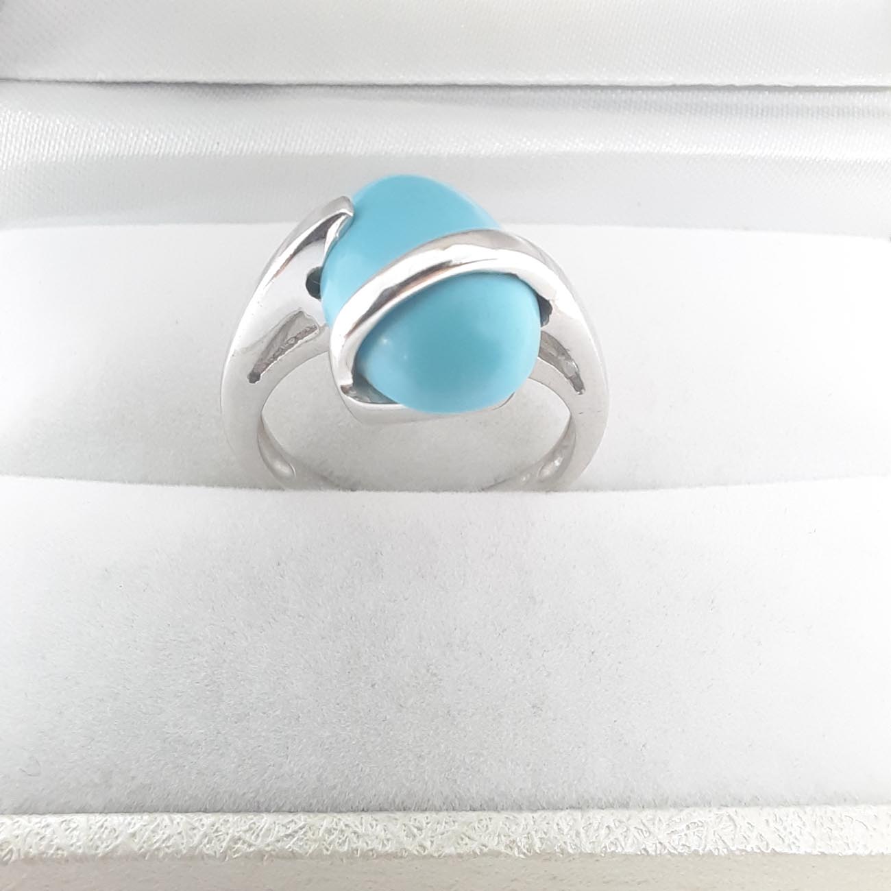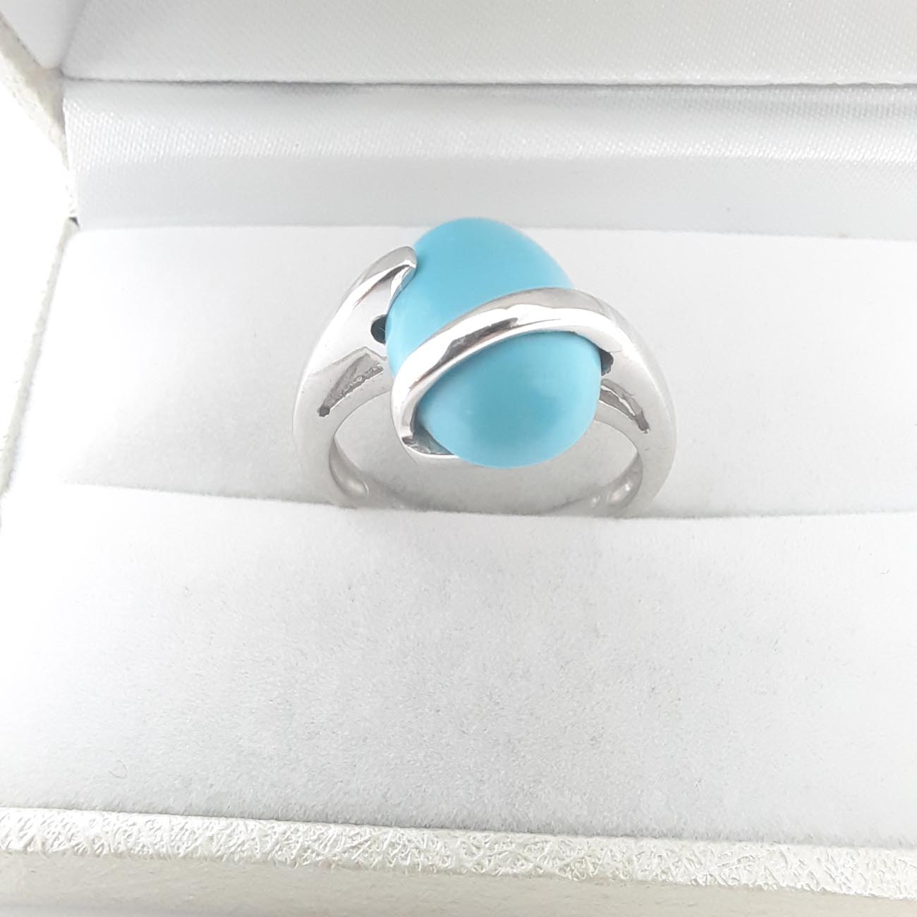 Υπέροχο δαχτυλίδι, 14 καρατίων, σε κομψή γραμμή, με ένα μεγάλο τυρκουάζ σε οβάλ σχήμα που το αγκαλιάζει μια κορδέλα από λευκόχρυσο και με μεγάλη ιστορία καθώς στην Περσία της εποχής του Μεγάλου Αλεξάνδρου το τυρκουάζ ήταν η πέτρα για τα δαχτυλίδια αρραβώνων, οι Ρώσοι και οι Ινδοί το θεωρούν πετράδι του έρωτα και στην Ελλάδα θεωρείται προστάτης της καλής υγείας και φύλακας από κάθε αρνητική ενέργεια και βασκανία  (από αυτήν ξεκινά και η ιδέα της “θαλασσιάς χάντρας”)