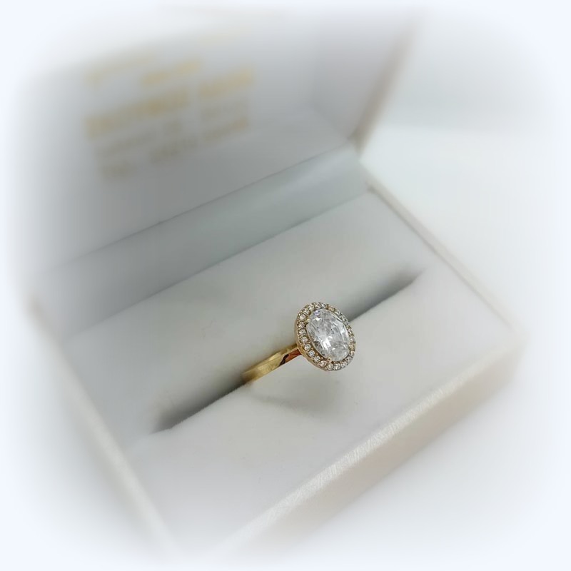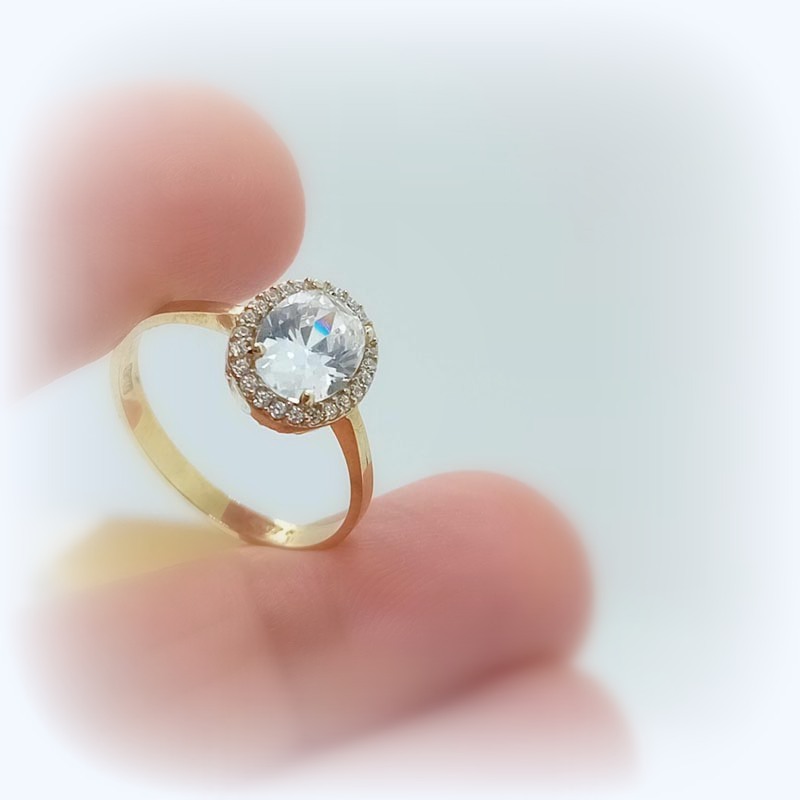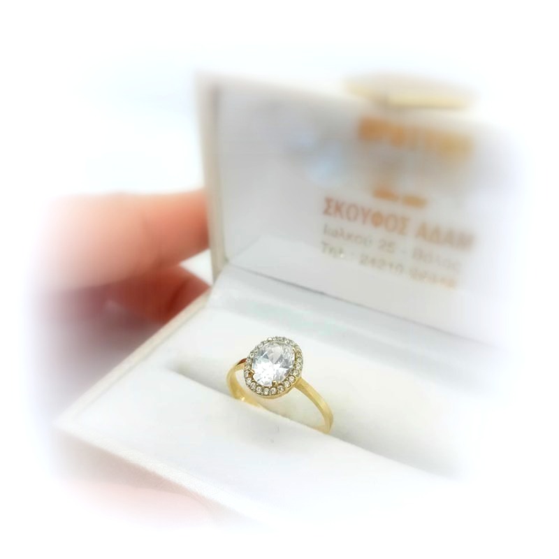 Κλασικό και διαχρονικό κόσμημα, μονόπτερο δαχτυλίδι από ΧΡΥΣΟ 9 καράτια με ένα πελώριο εντυπωσιακό λευκό ζιργκόν σε οβάλ design, περιστοιχισμένο από μικρά διακριτικά λευκά ζιργκόν και ωραία λουστρέ γάμπα, ιδανικό για πρόταση γάμου αλλά και για για δώρο βαλεντίνου, γιορτής, επετείου.