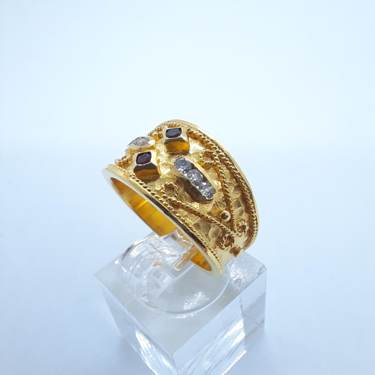 Βαρύ και πολύτιμο κόσμημα με έμπνευση από τις Βυζαντινές αρχόντισσες, με φαρδιά γάμπα, υπέροχο ανάγλυφο σκάλισμα, λευκά ζιργκόν και ρουμπίνια. Ιδανικό για μια πολύ αγαπημένη γυναίκα.
